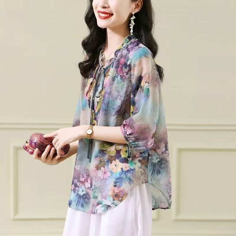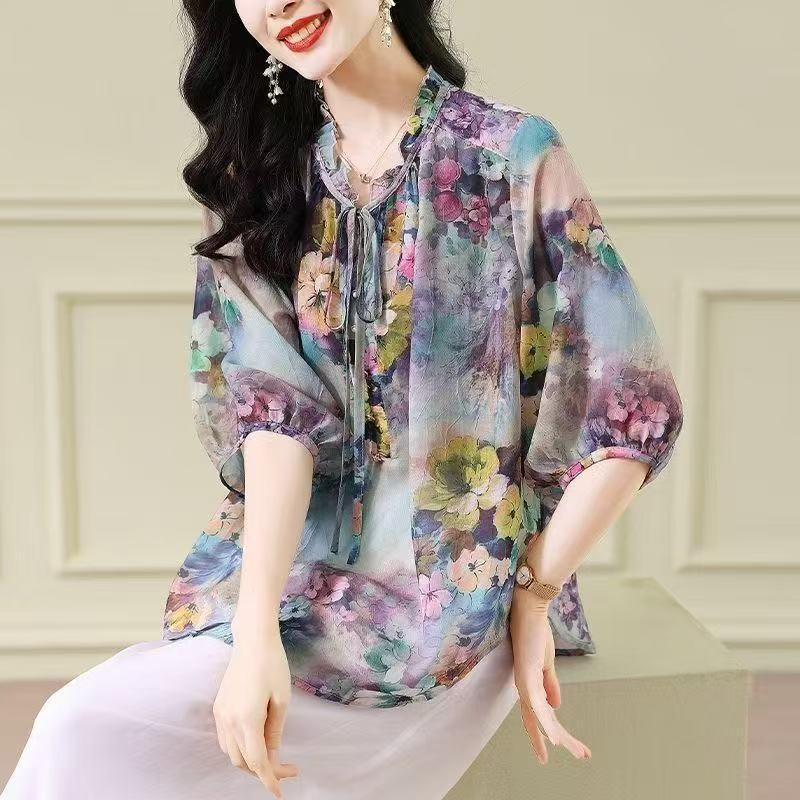 第 2 件 : 大尺碼媽媽裝雪紡衫女夏季碎花高端復古寬鬆遮肚子顯瘦高貴洋氣上衣
