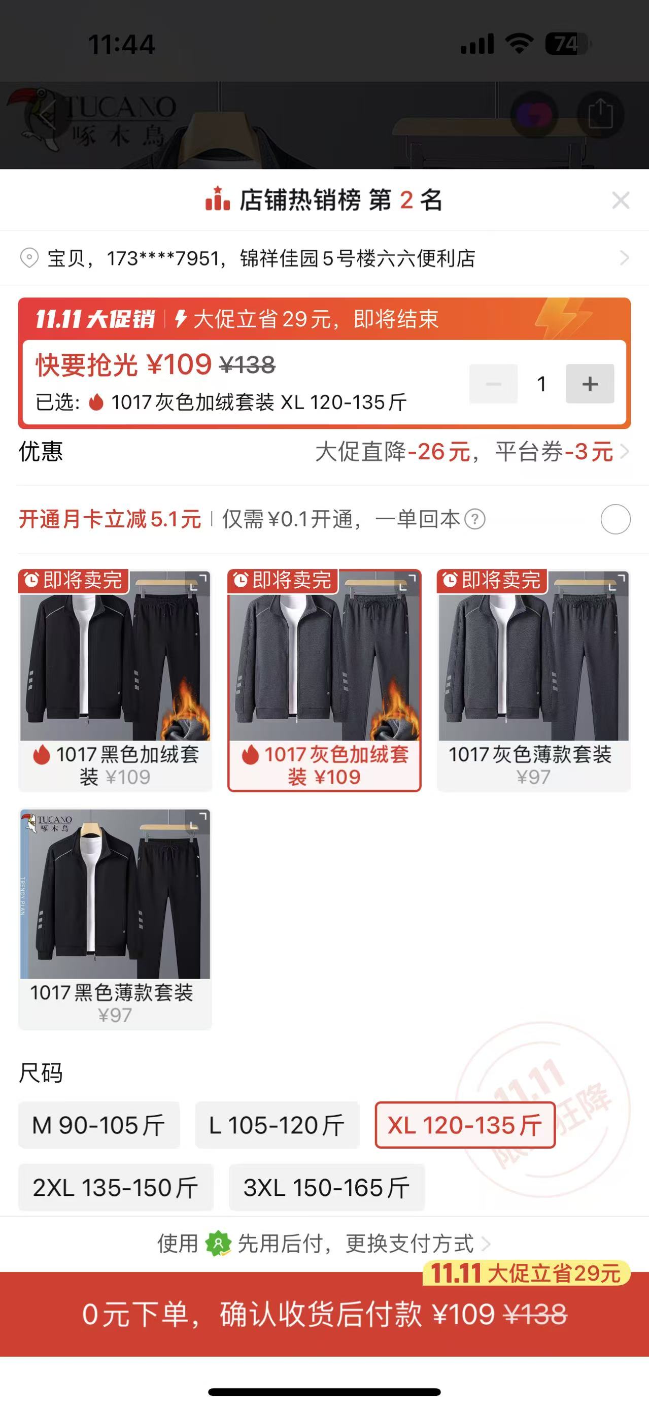 ④灰色加絨套裝1套XL尺碼 109元:https://mobile.yangkeduo.com/goods.html?ps=bFDlyAleFU