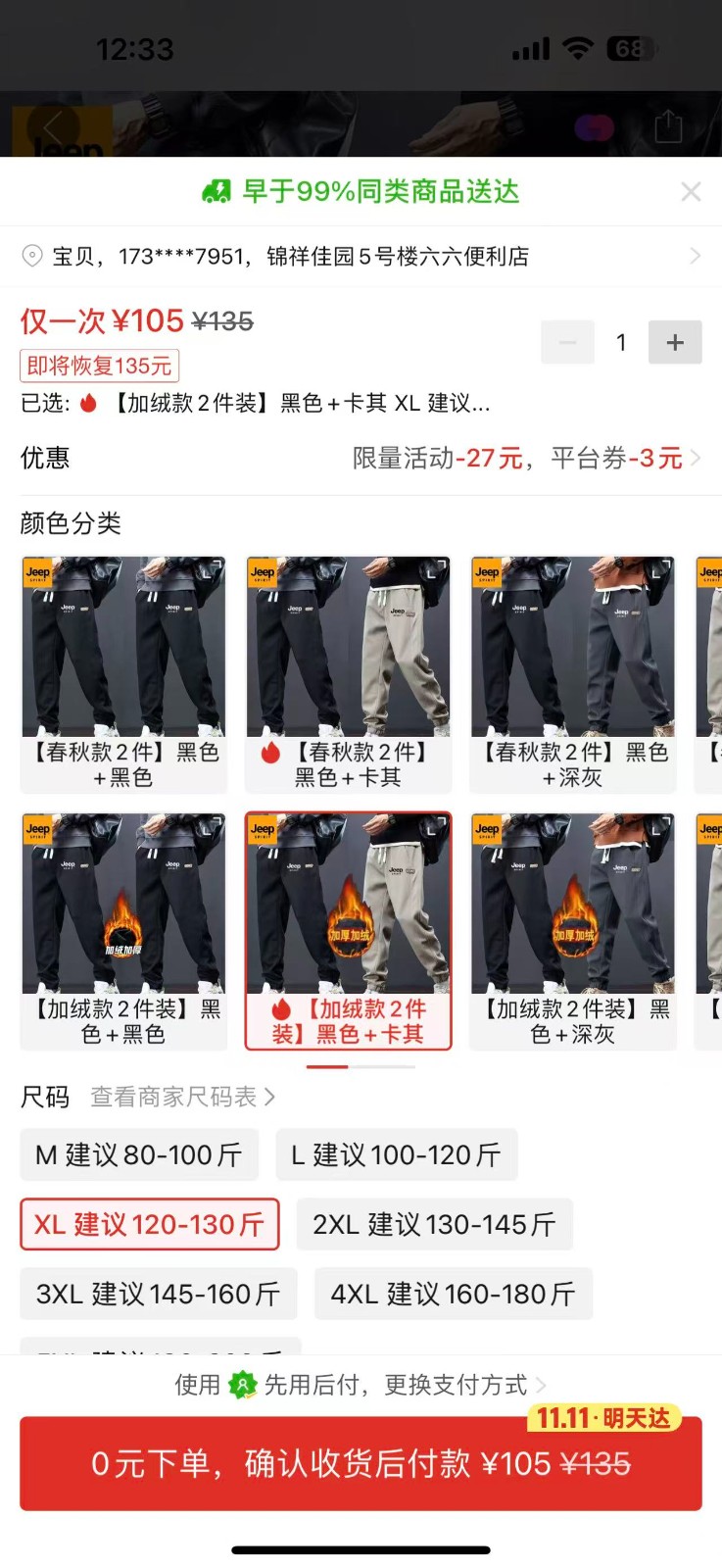 ⑥JEEP黑和卡其加絨褲子各一條X尺碼 105元:https://mobile.yangkeduo.com/goods.html?ps=4lw3lLo4ZD