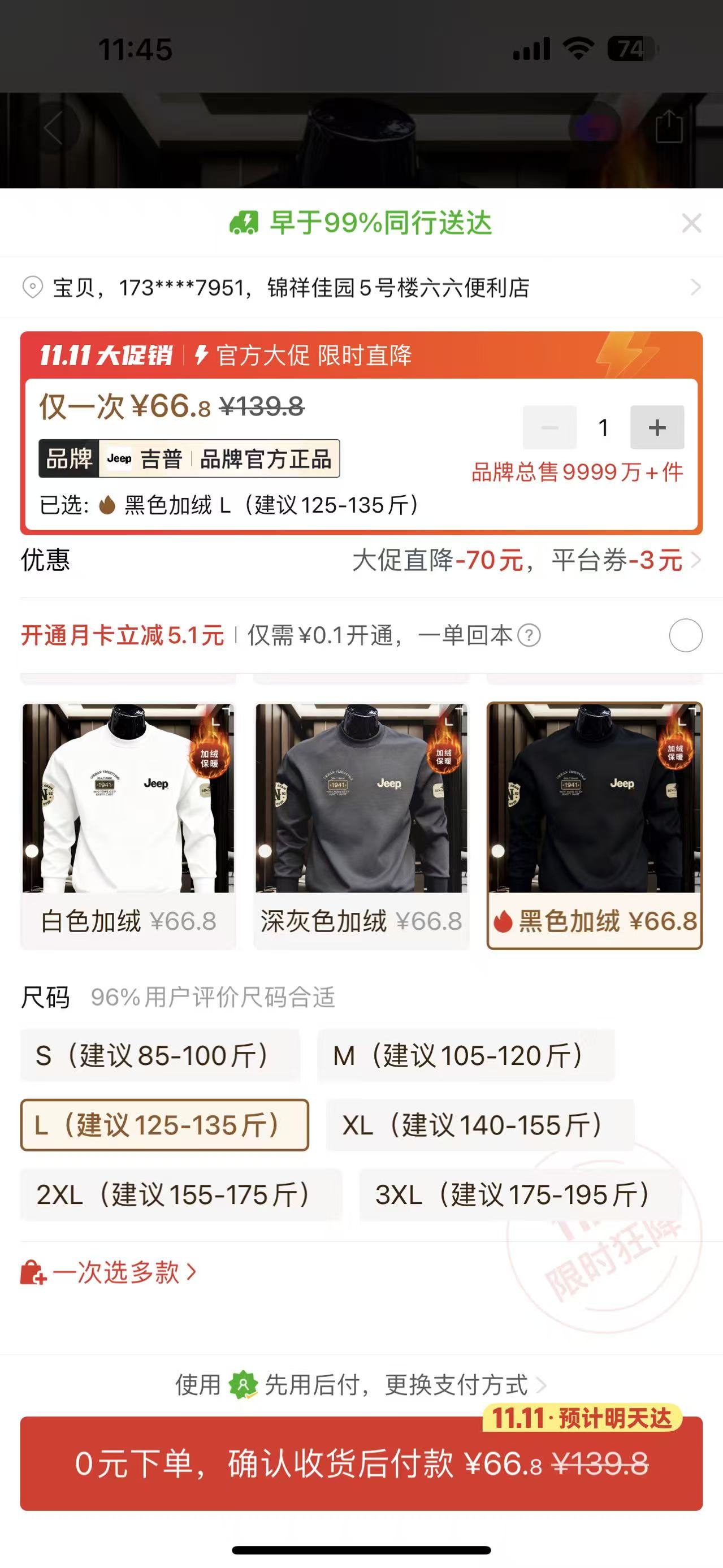 ⑤黑色加絨JEEP錶衛衣一件L尺碼 66.8元:https://mobile.yangkeduo.com/goods1.html?ps=ZeyPa9yJdm