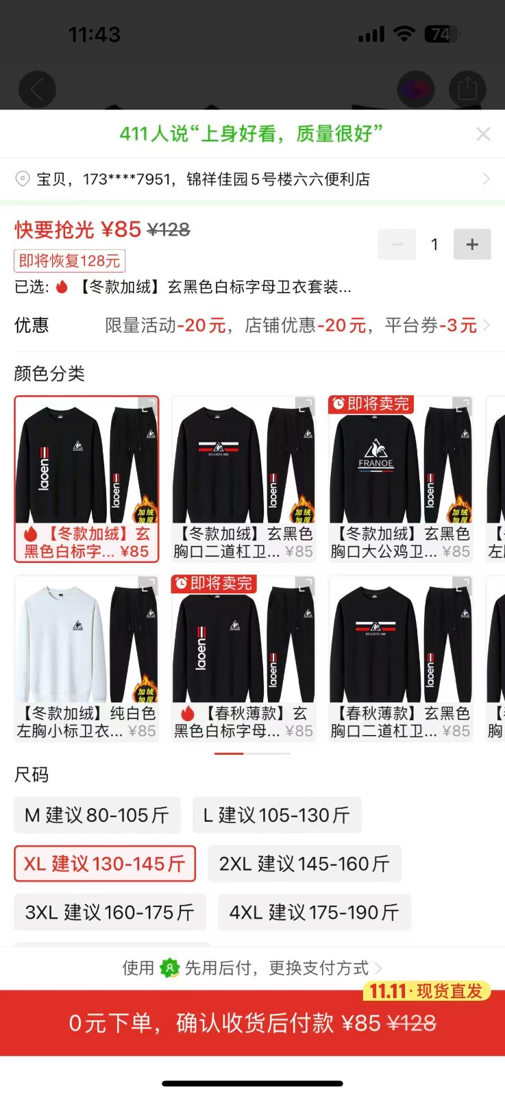 ②黑色白標志加絨衛衣套裝XL尺碼1套 85元:https://mobile.yangkeduo.com/goods.html?ps=343TPkcHnA