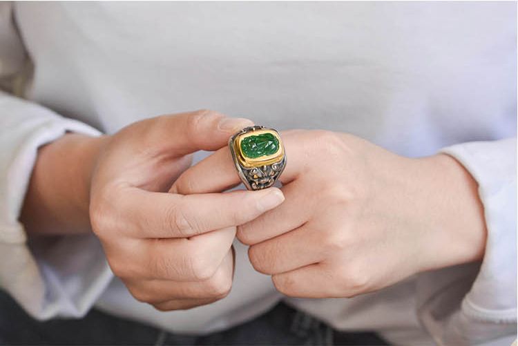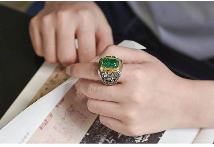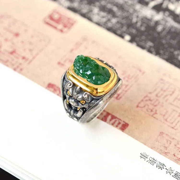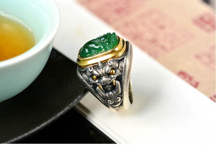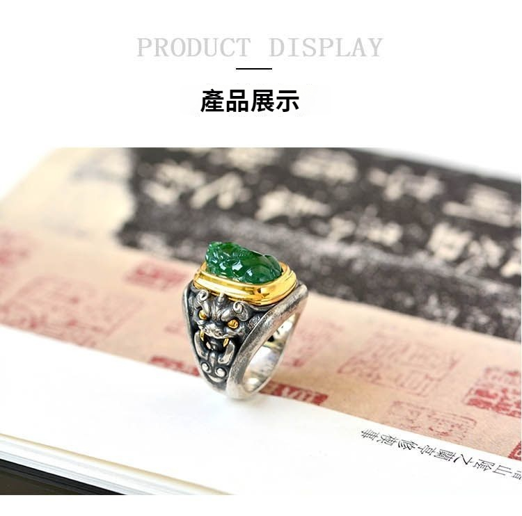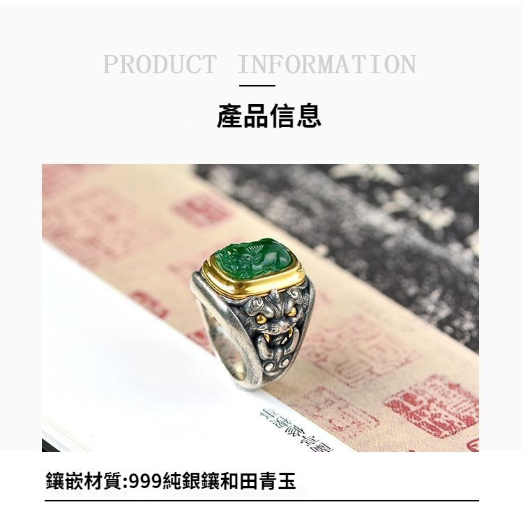 純銀鑲青玉貔貅戒指,新中式潮流送男女朋友父母親節禮物,不掉色