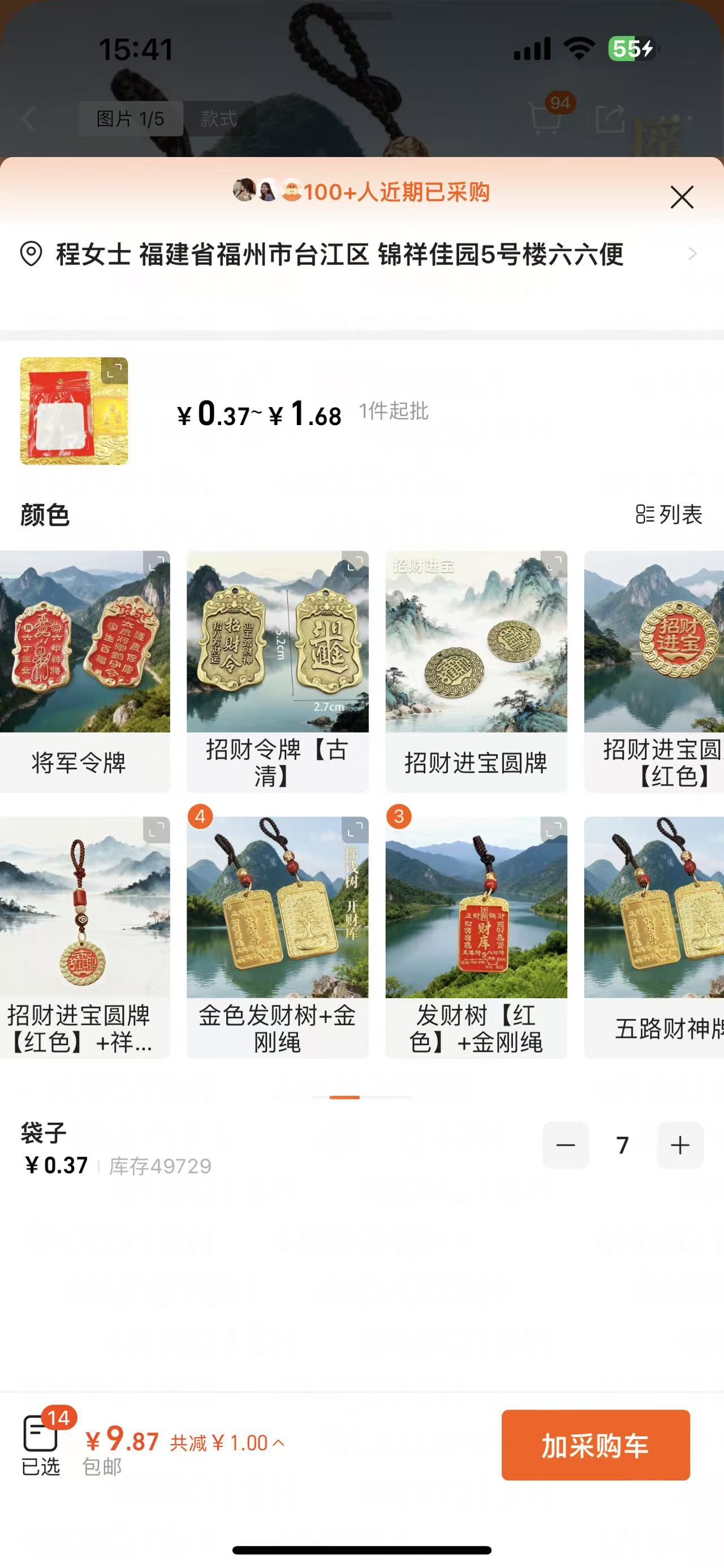 ①紅色財庫牌+金剛繩3個+②金色財庫牌+金剛繩4個+③袋子7個(9.87元)