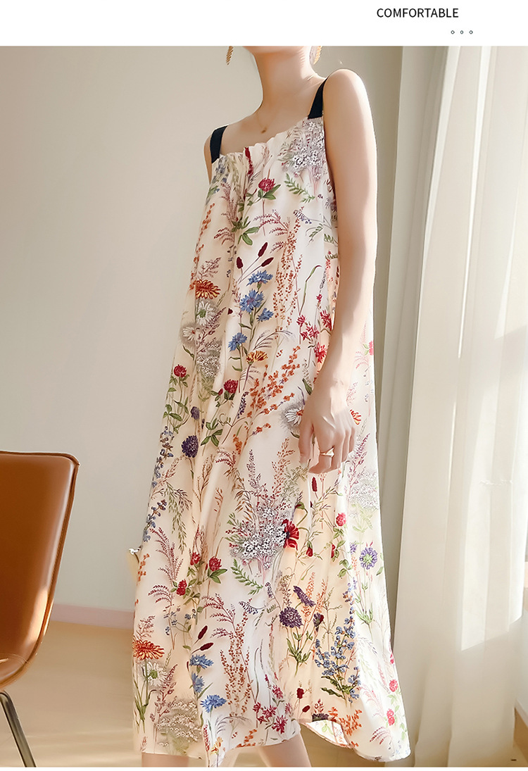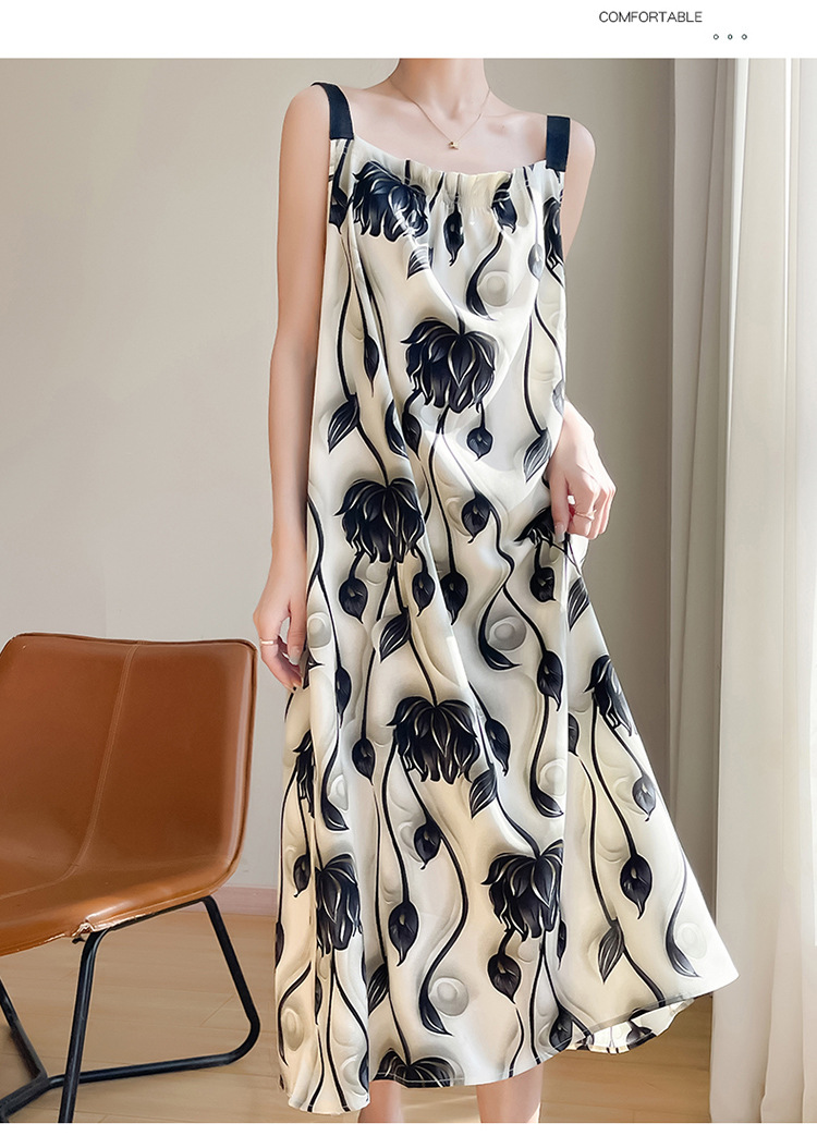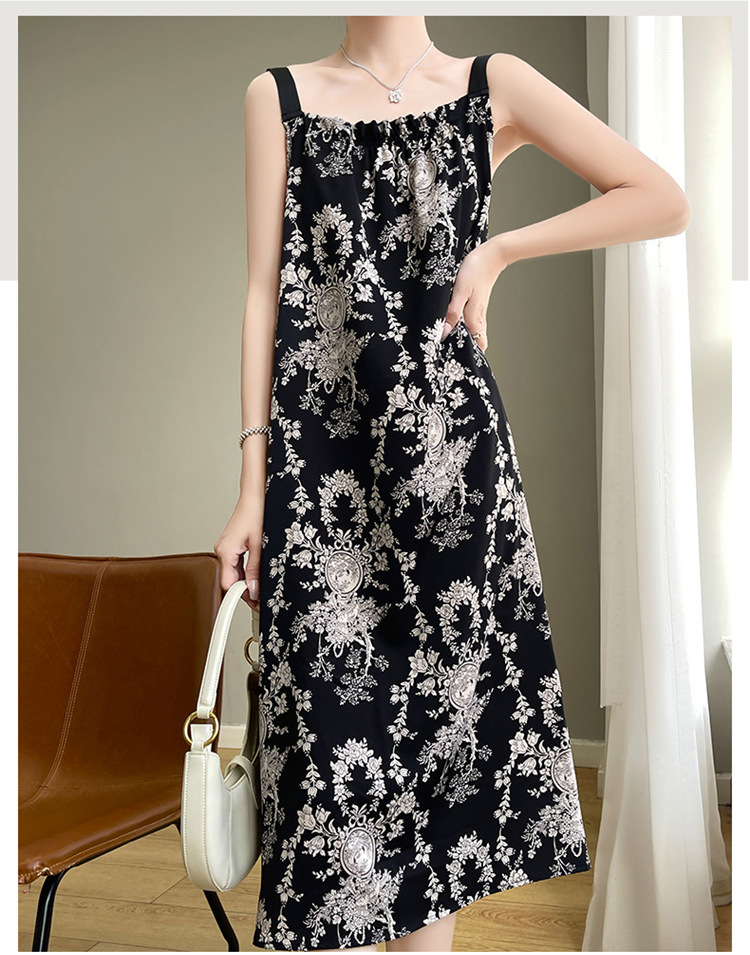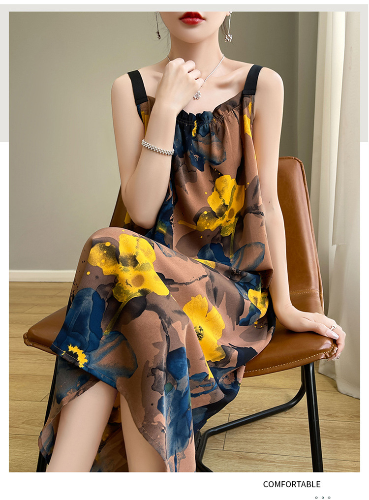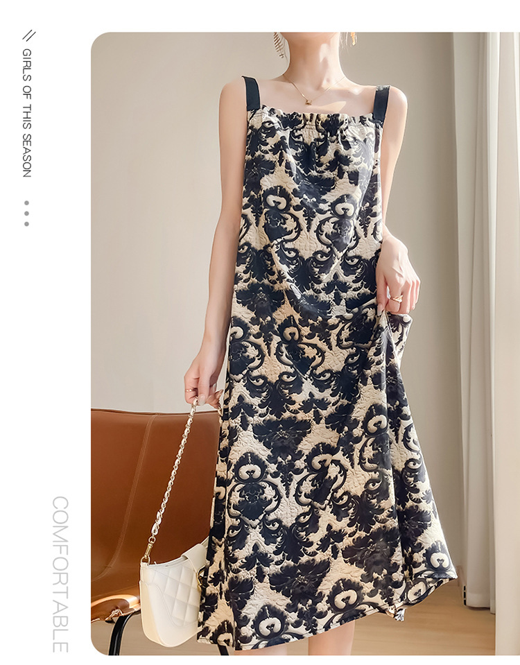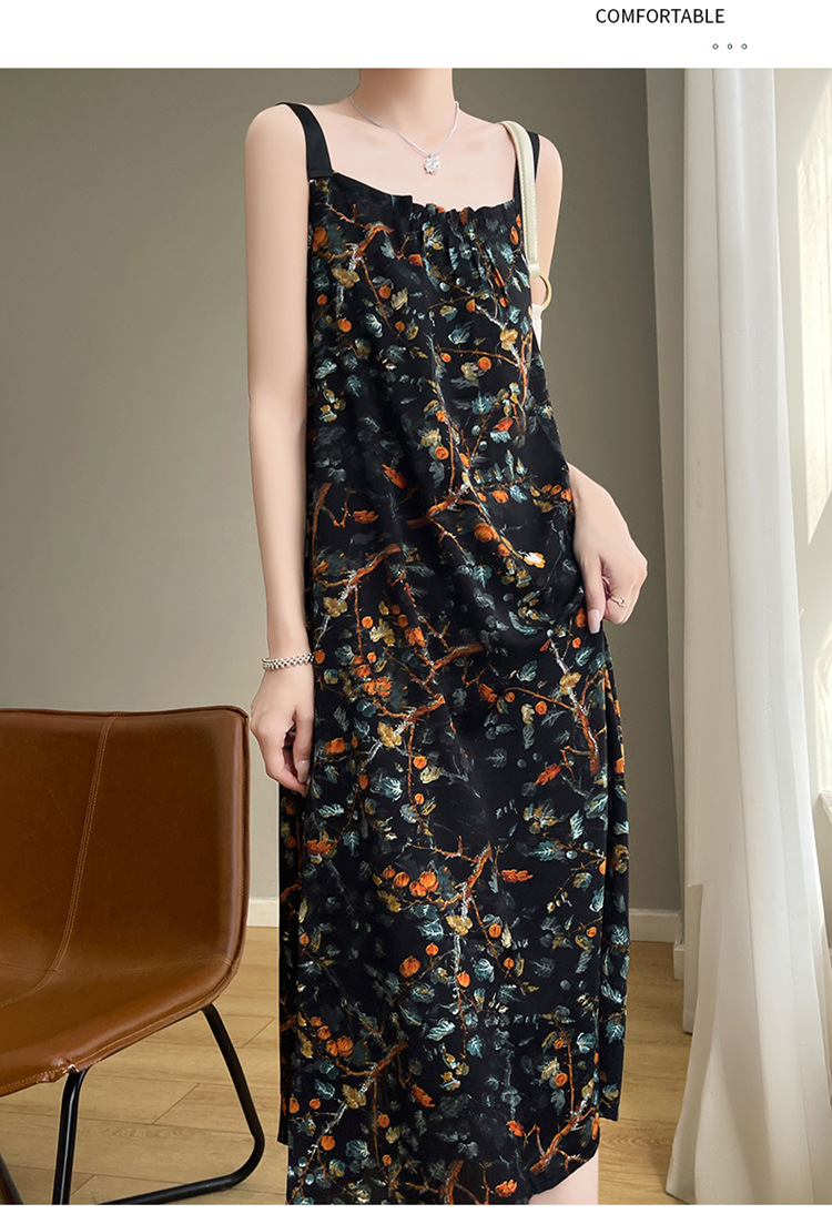 2025年夏季新款緞面印花復古吊帶裙多色碎花中長款大尺碼洋裝女