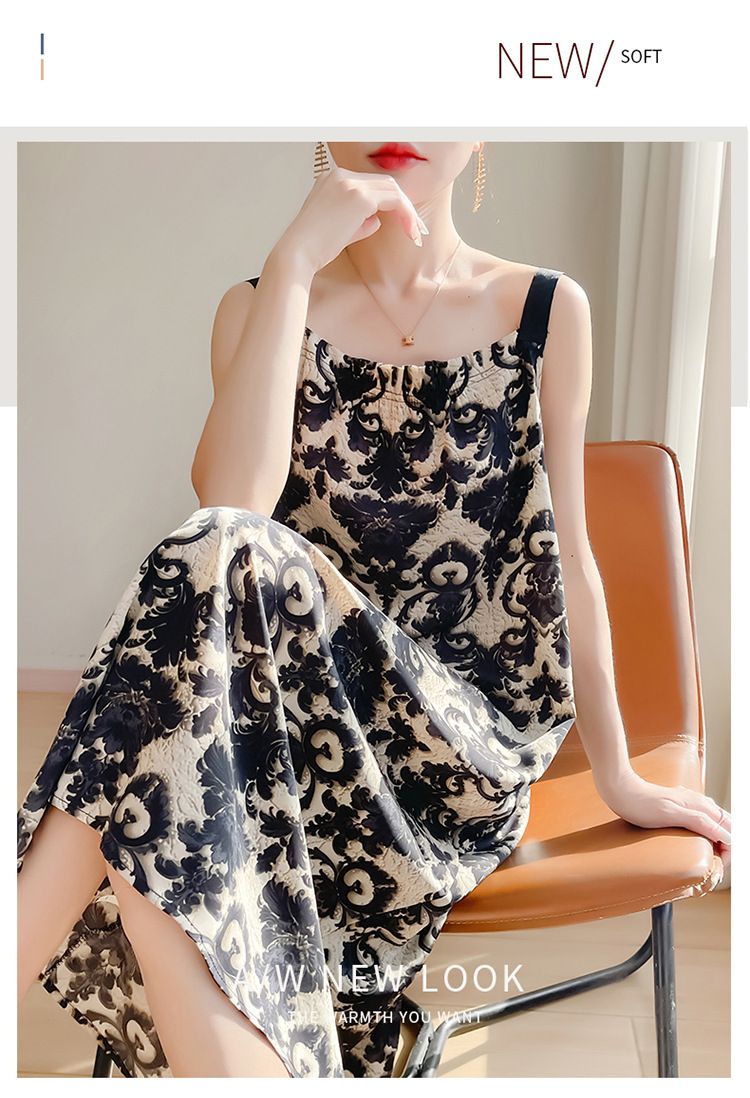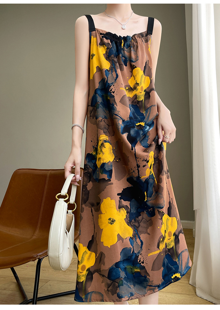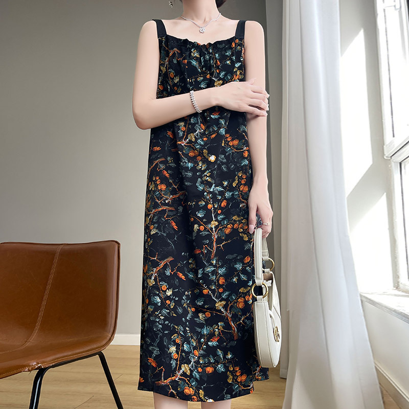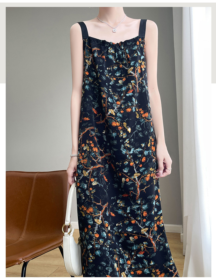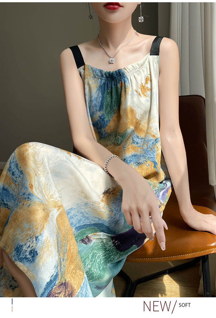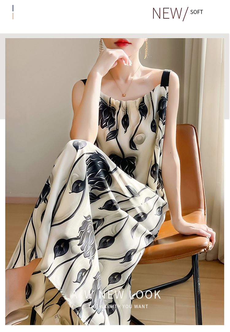 2025年夏季新款緞面印花復古吊帶裙多色碎花中長款大尺碼洋裝女