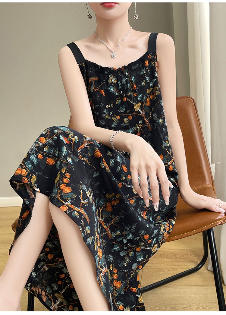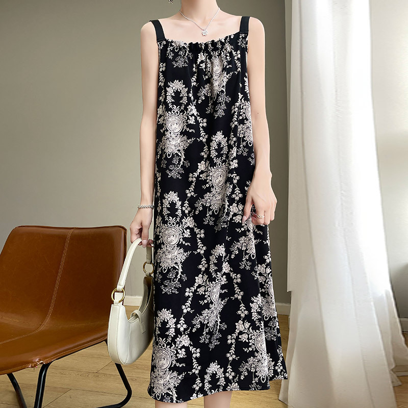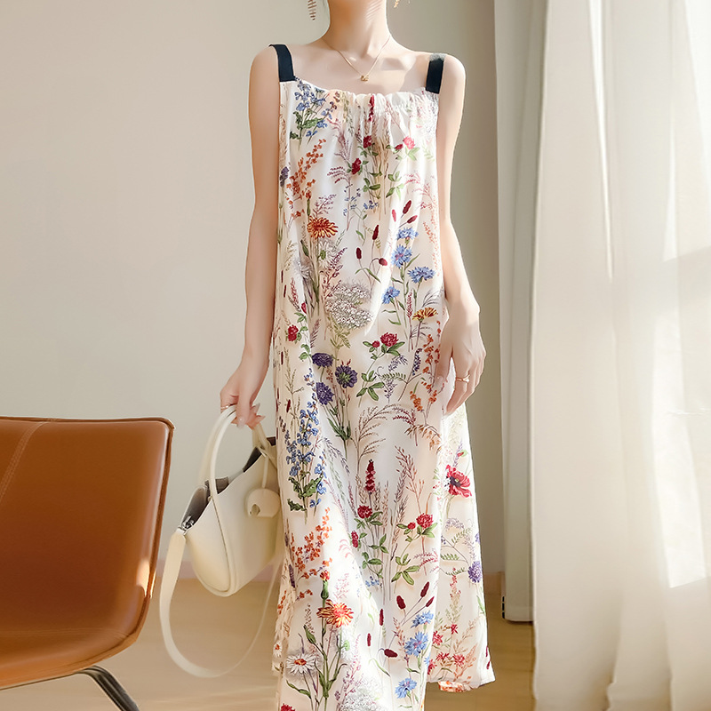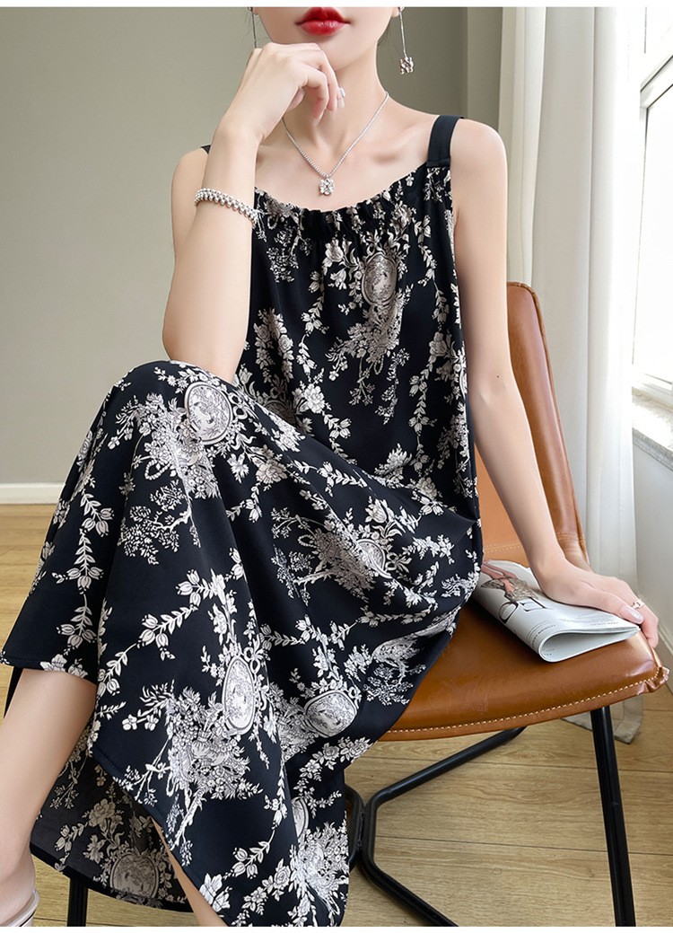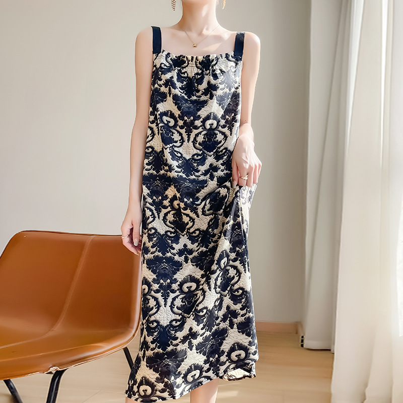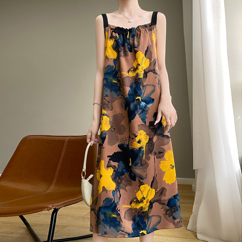 2025年夏季新款緞面印花復古吊帶裙多色碎花中長款大尺碼洋裝女