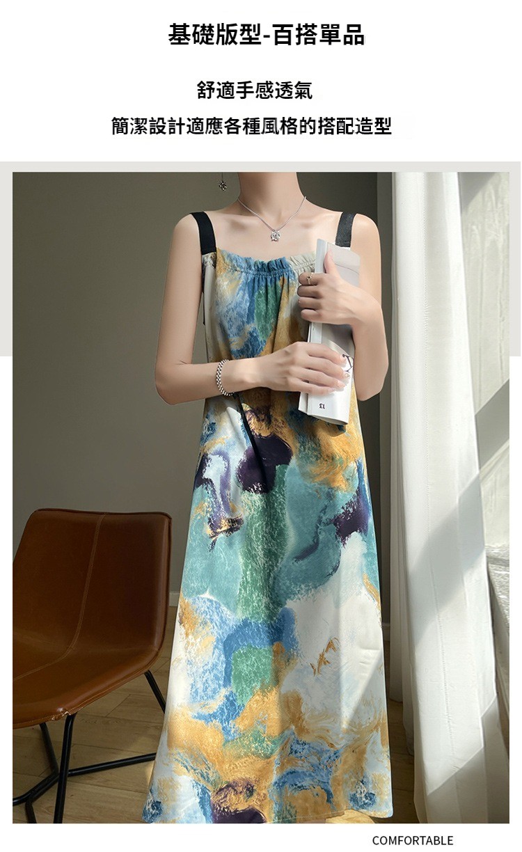 第 2 件 : 2025年夏季新款緞面印花復古吊帶裙多色碎花中長款大尺碼洋裝女