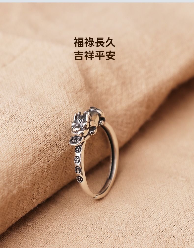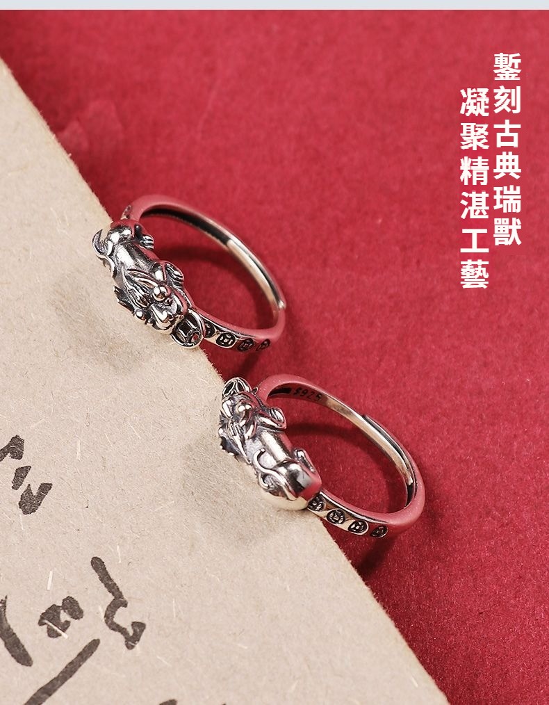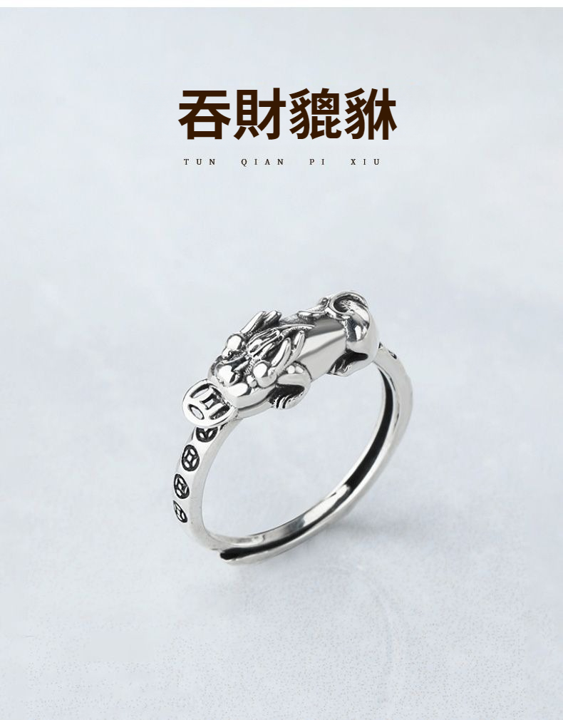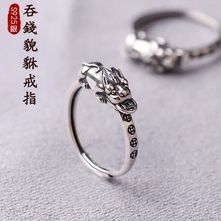 s925純銀招財貔貅戒指旺夫守財貔恘小眾設計復古轉運食指戒