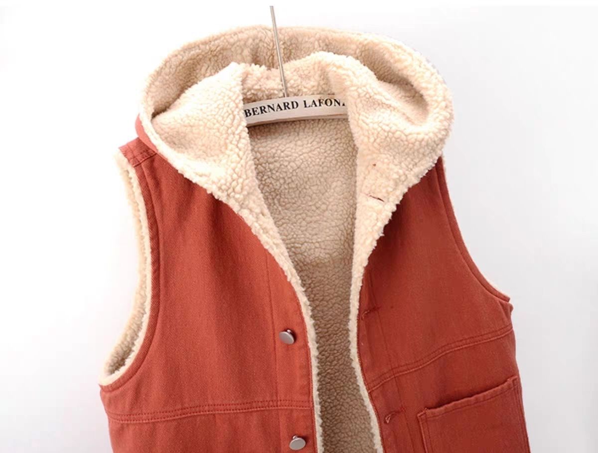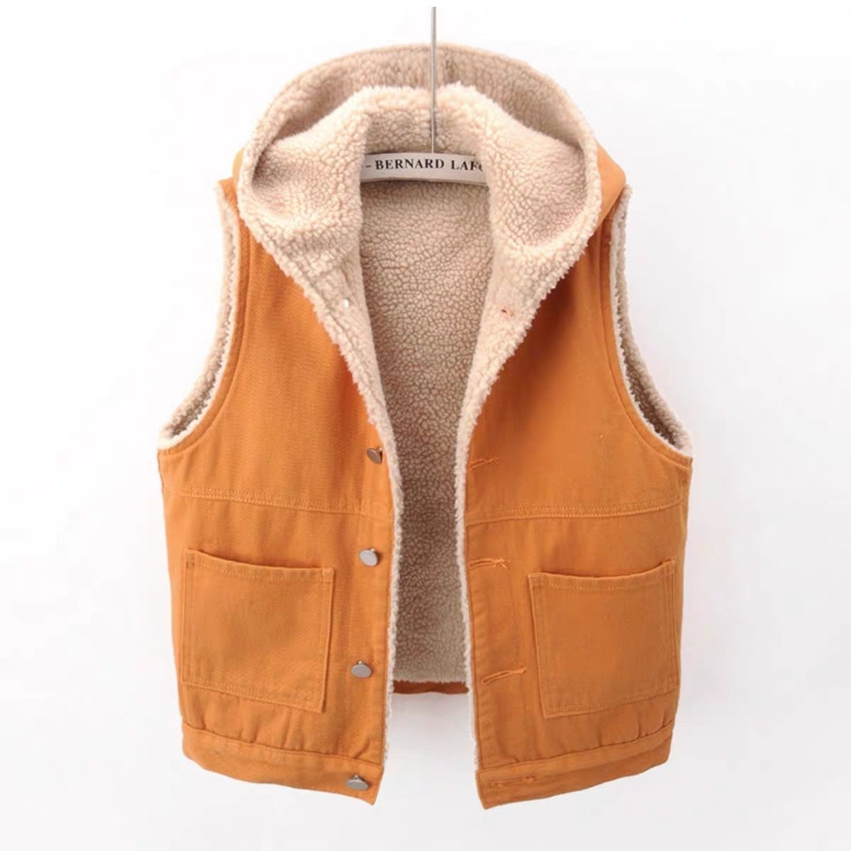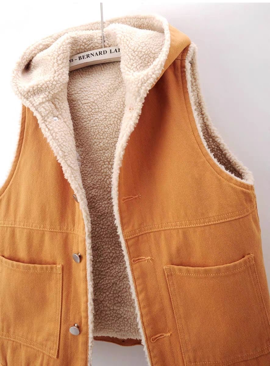 2025秋冬新款小羊毛加絨加厚連帽牛仔馬甲女寬鬆簡約馬夾背心坎肩