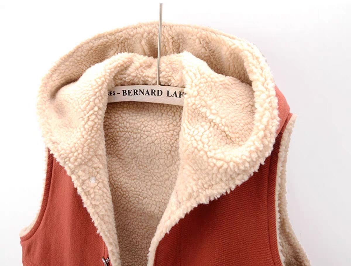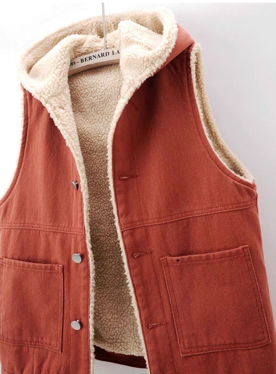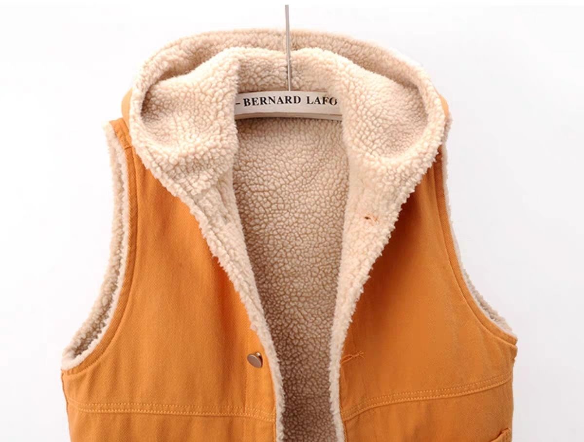 2025秋冬新款小羊毛加絨加厚連帽牛仔馬甲女寬鬆簡約馬夾背心坎肩