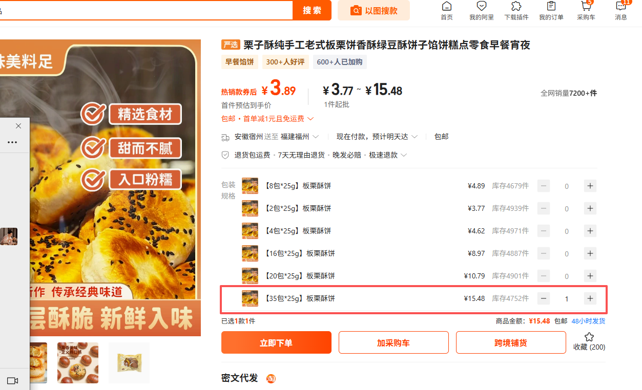 ①板栗餅 30包 15元 https://detail.1688.com/offer/891554103634.html?spm=a26352.13672862.offerlist.4.3f021e62pRWJe7&offerId=891554103634&sortType=&pageId=&abBizDataType=cbuOffer&hotSaleSkuId=5740447093508&trace_log=normal&uuid=ba9d83a2f21f45519b7ca9b2fbe8a082&forcePC=1765600509988