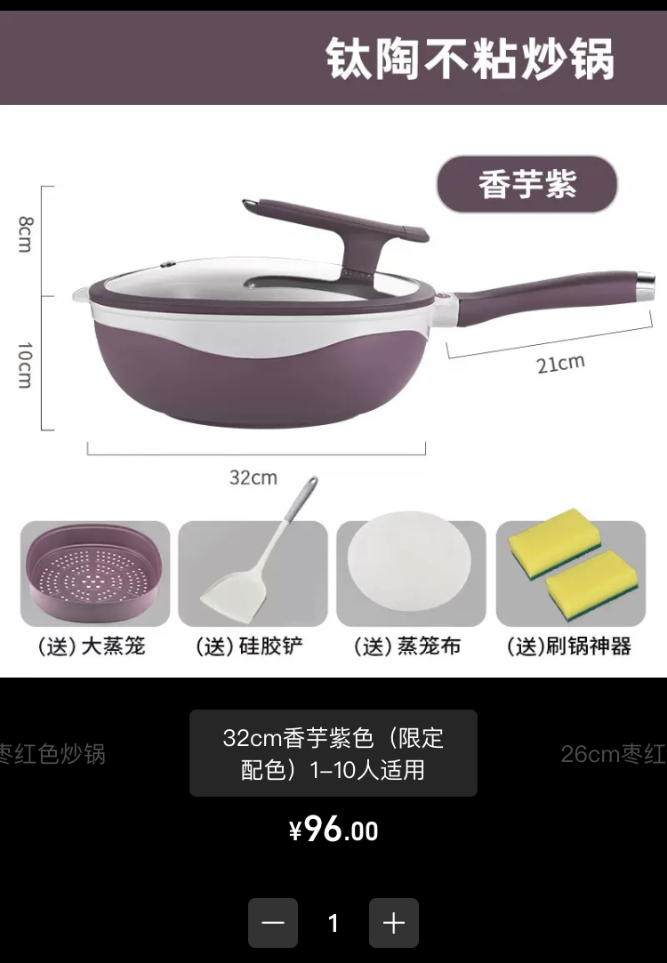 32CM 香芋紫色 鈦陶不粘炒鍋(送 大蒸籠 ,硅膠鏟,蒸籠佈,刷鍋神器) 1套 ,採購價:95元