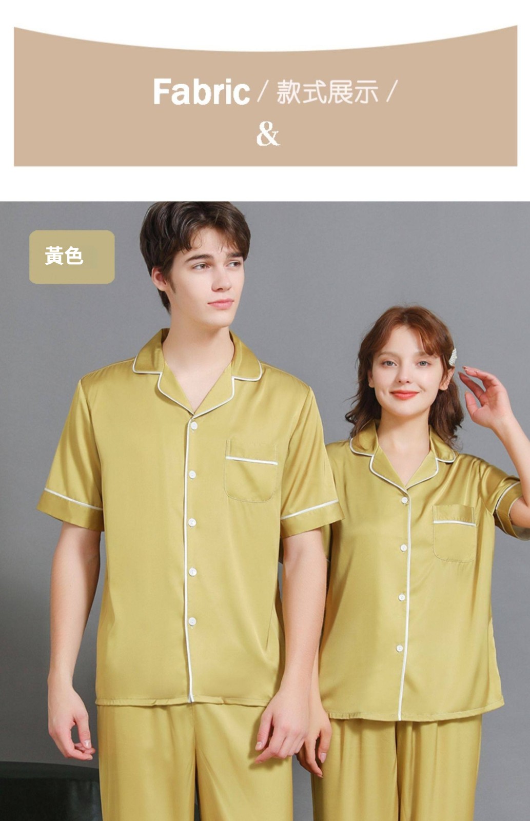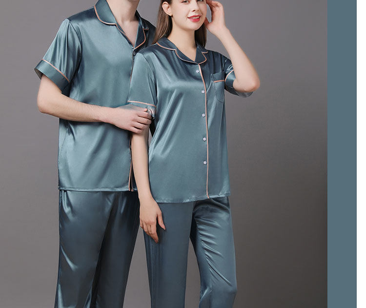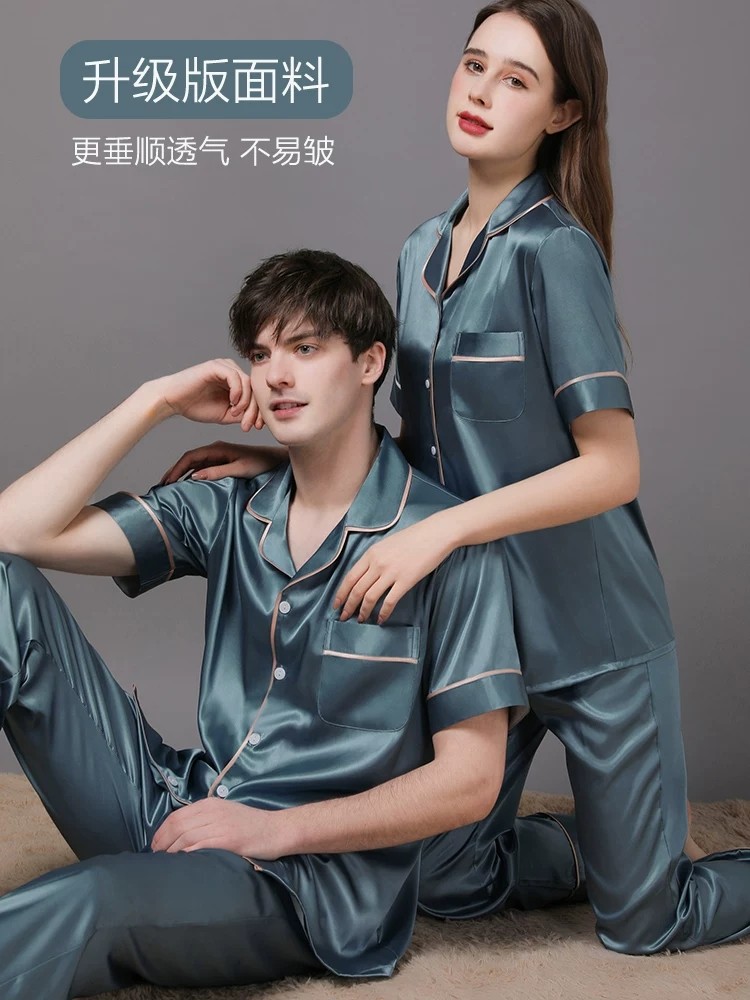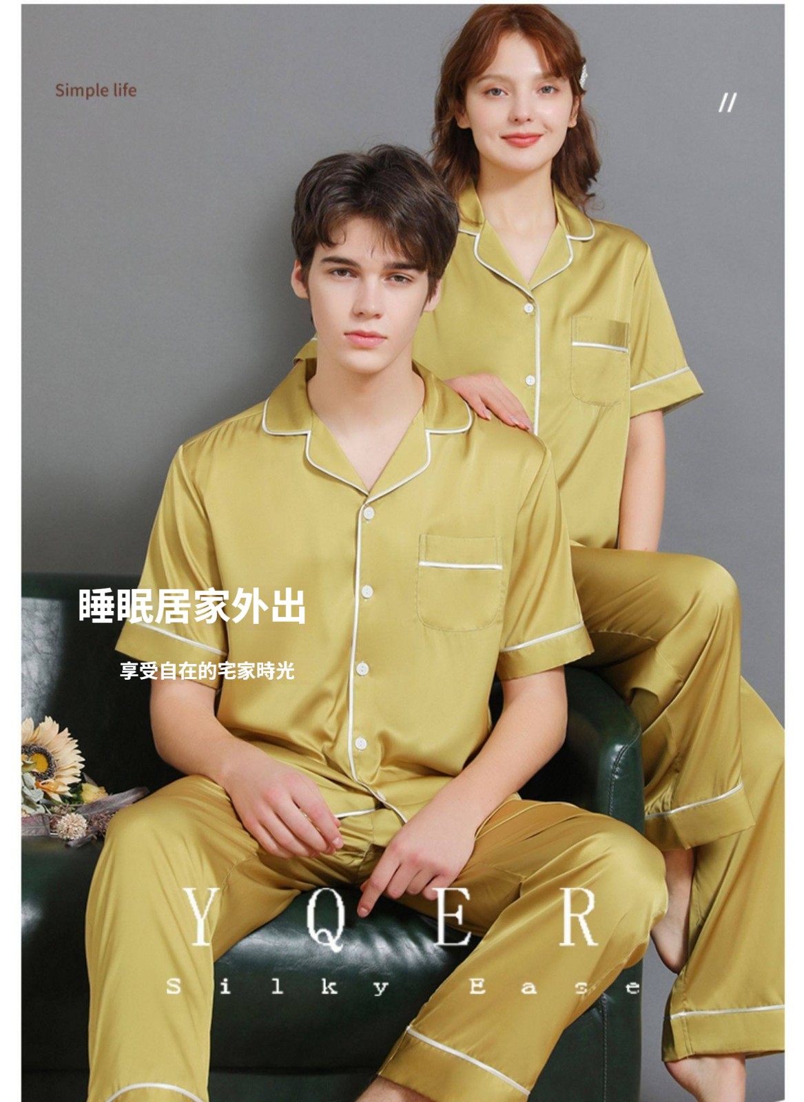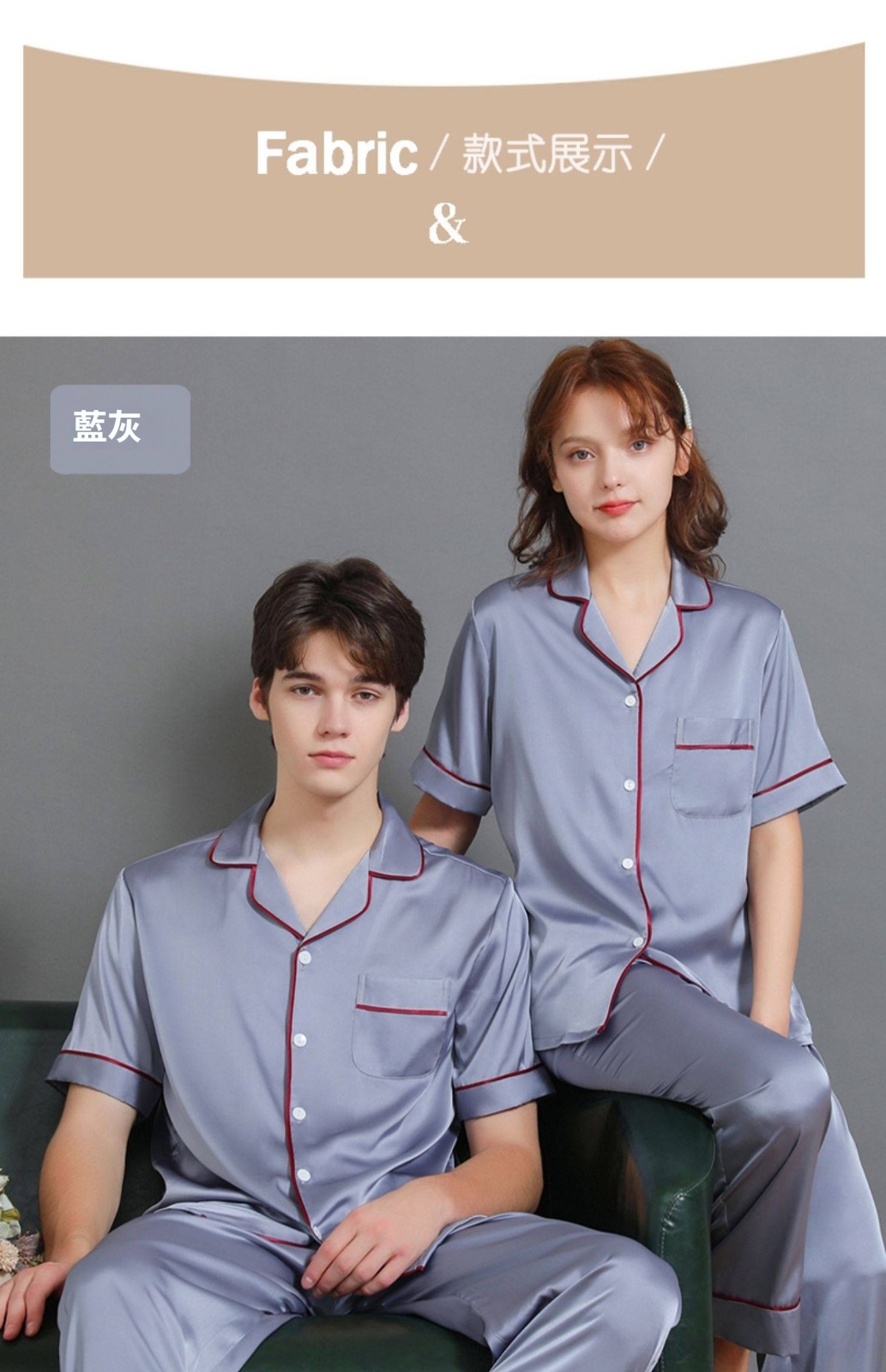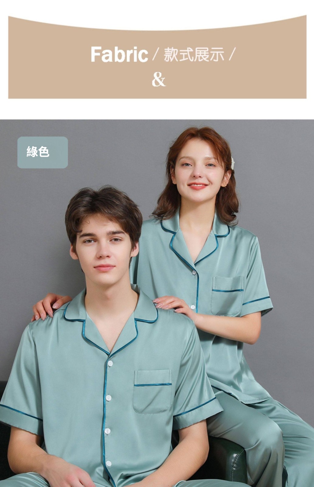 高級感冰絲半袖情侶睡衣,真絲半袖長褲簡約純色高級感春秋夏款套裝 男女