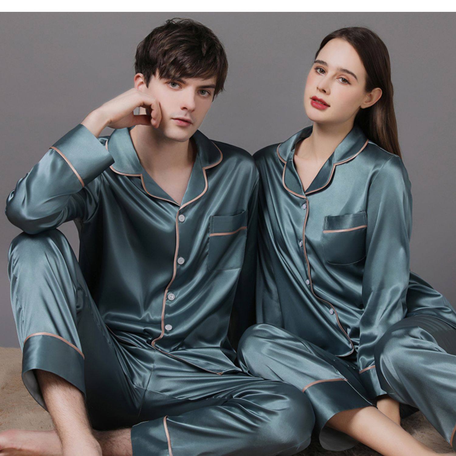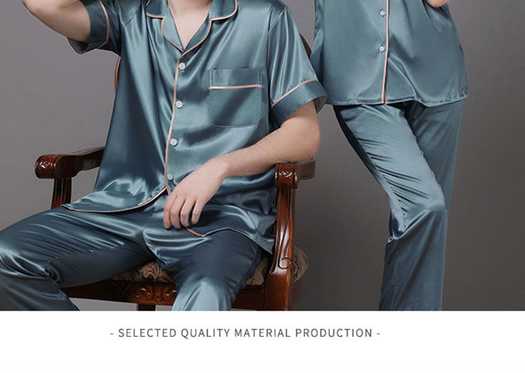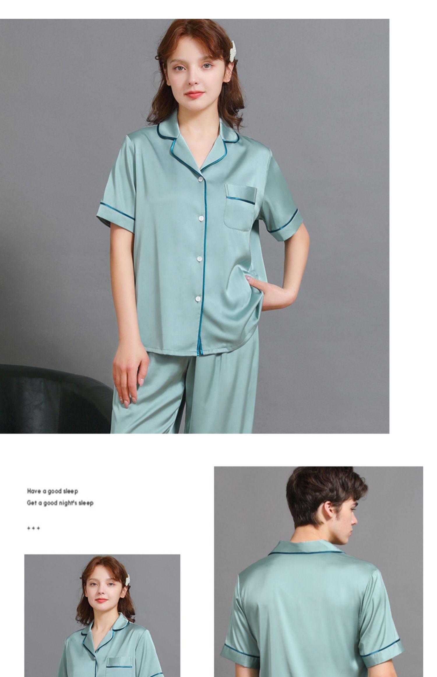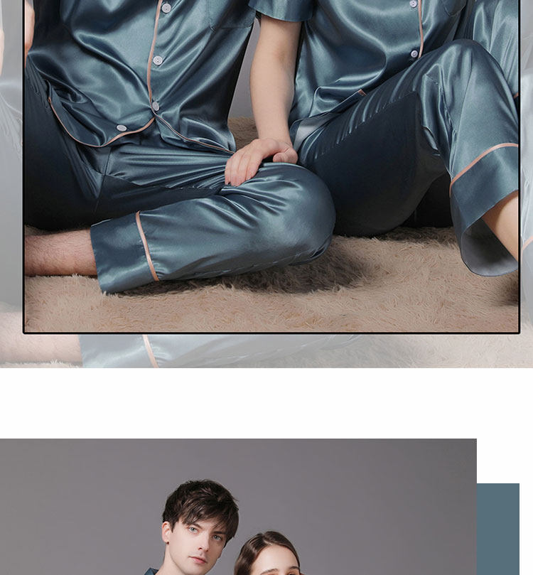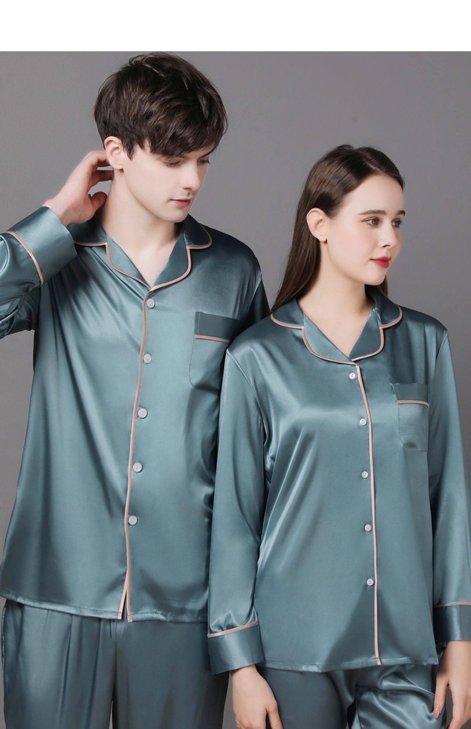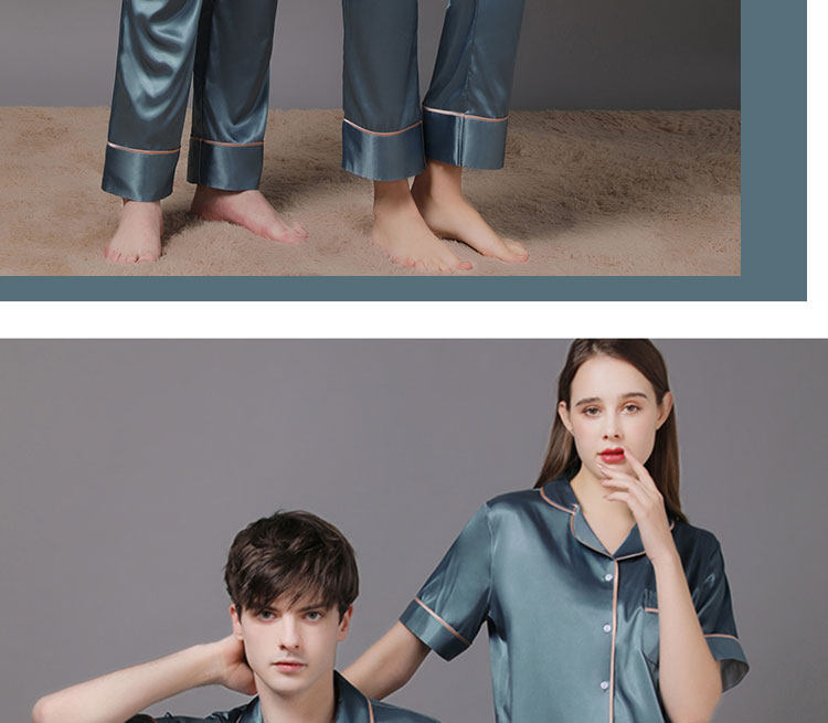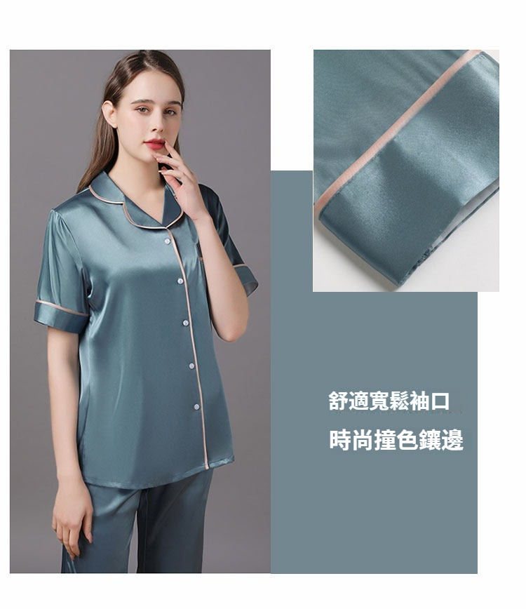 高級感冰絲半袖情侶睡衣,真絲半袖長褲簡約純色高級感春秋夏款套裝 男女