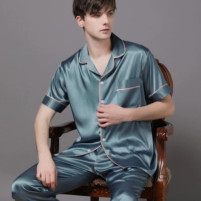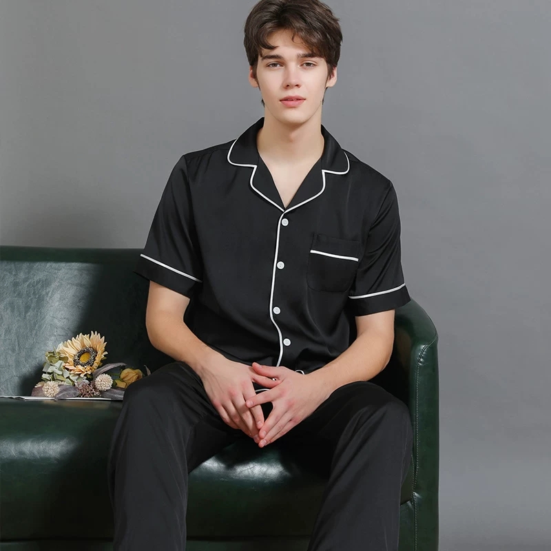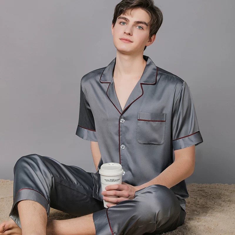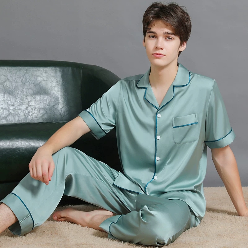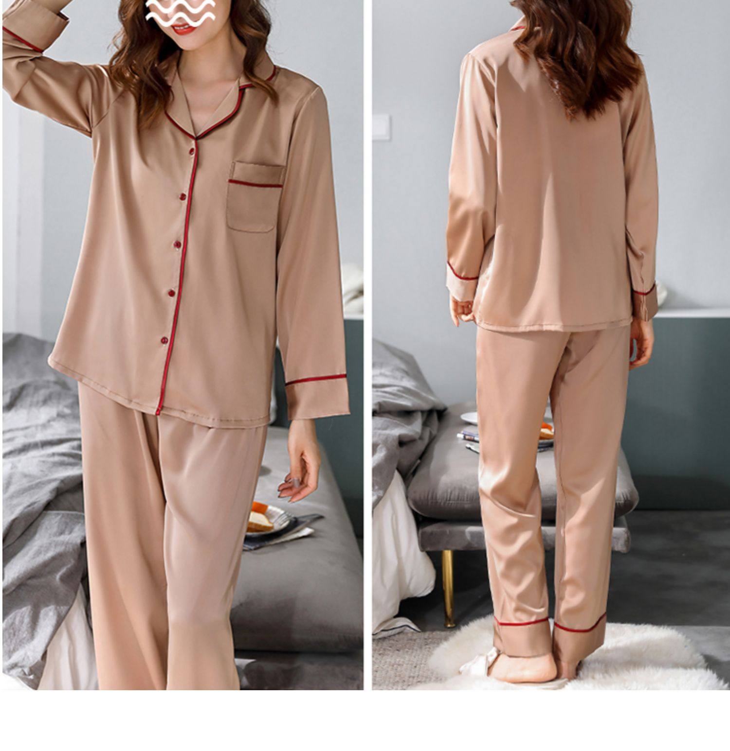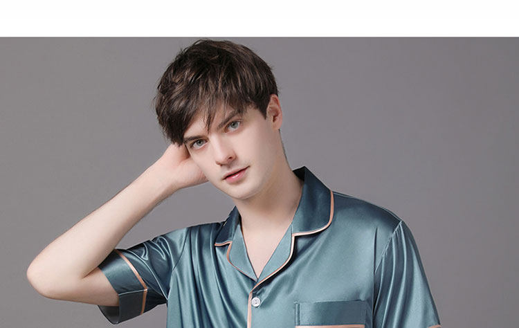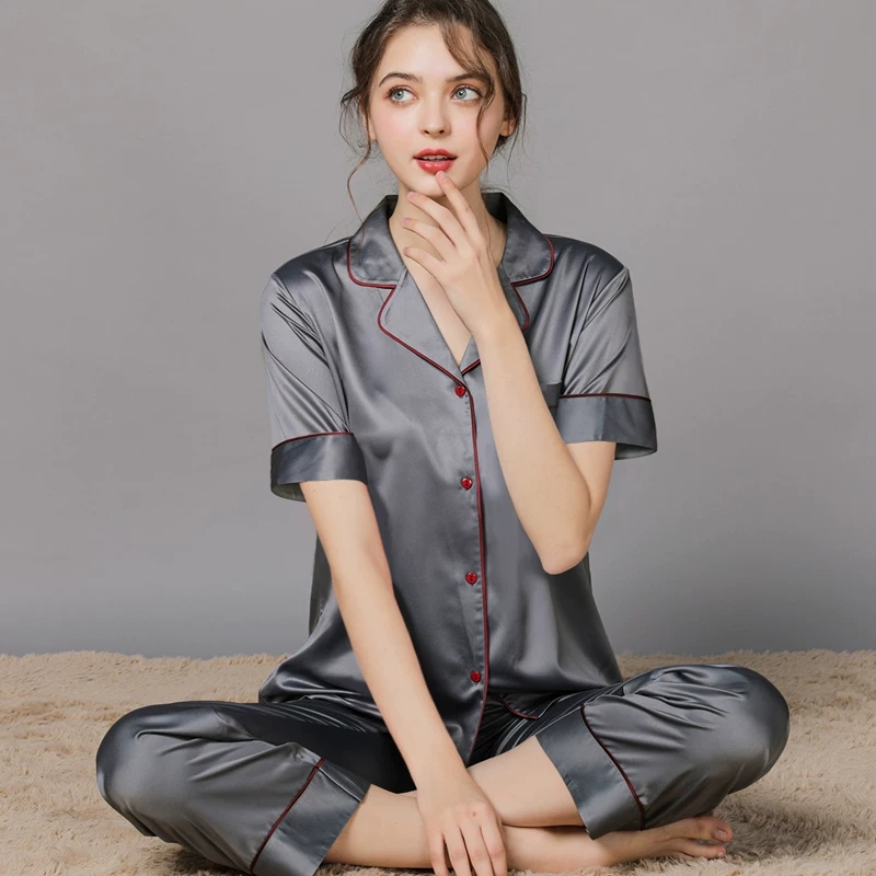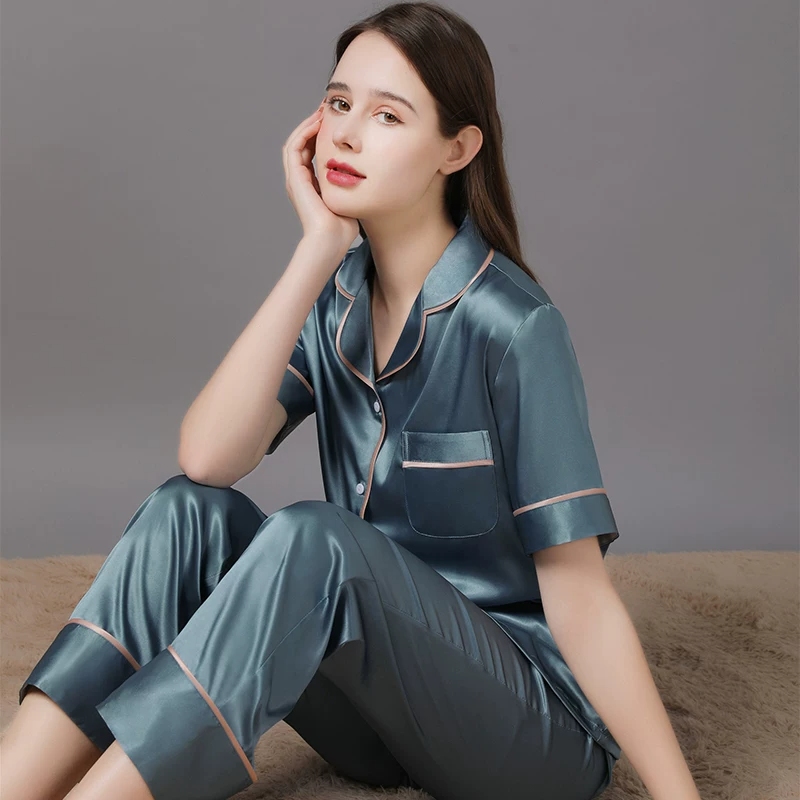 高級感冰絲半袖情侶睡衣,真絲半袖長褲簡約純色高級感春秋夏款套裝 男女