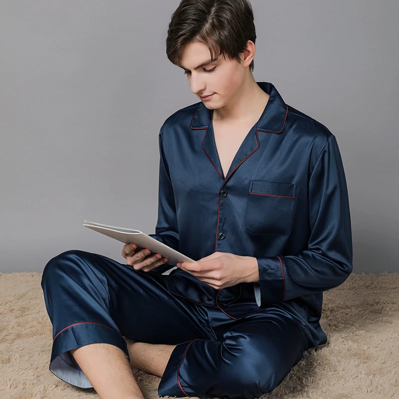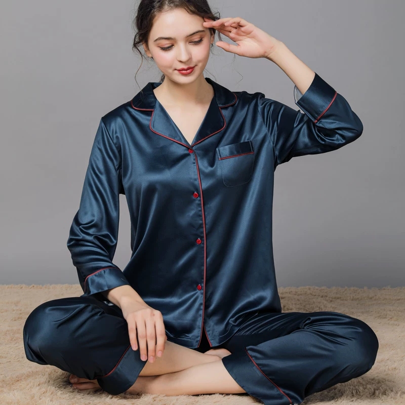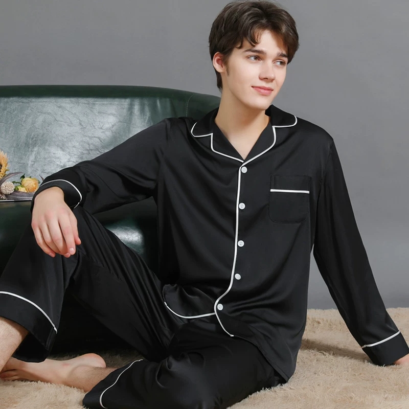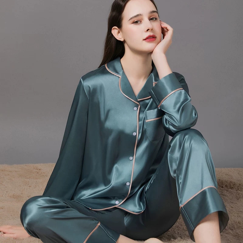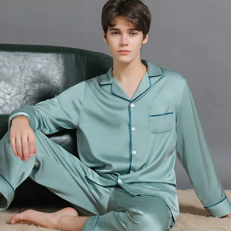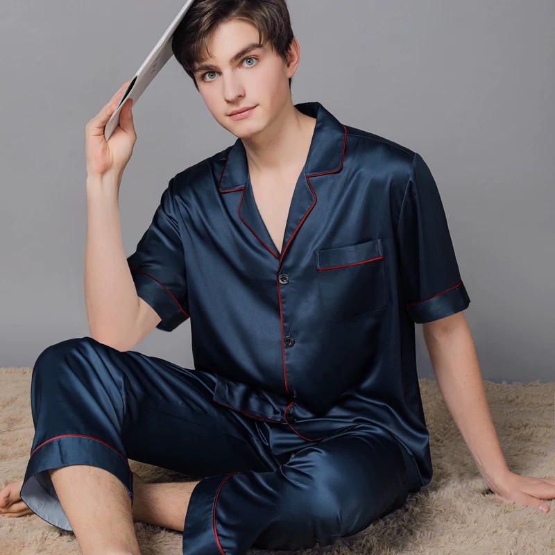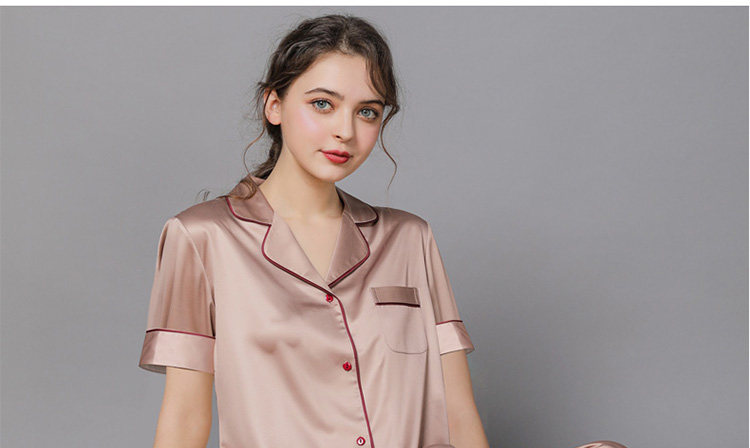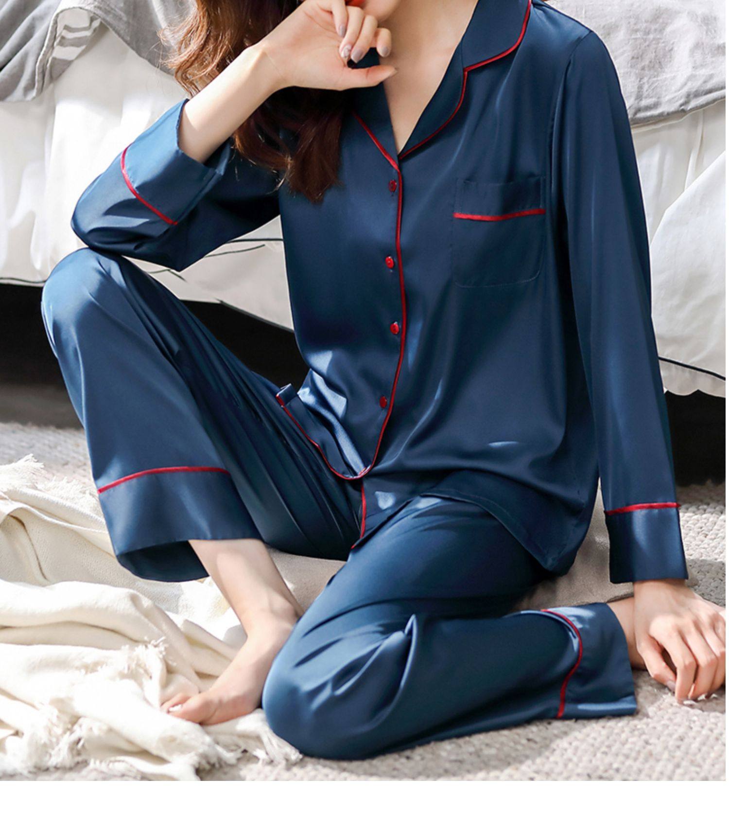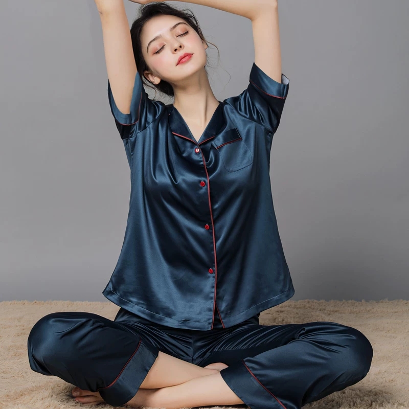 高級感冰絲半袖情侶睡衣,真絲半袖長褲簡約純色高級感春秋夏款套裝 男女