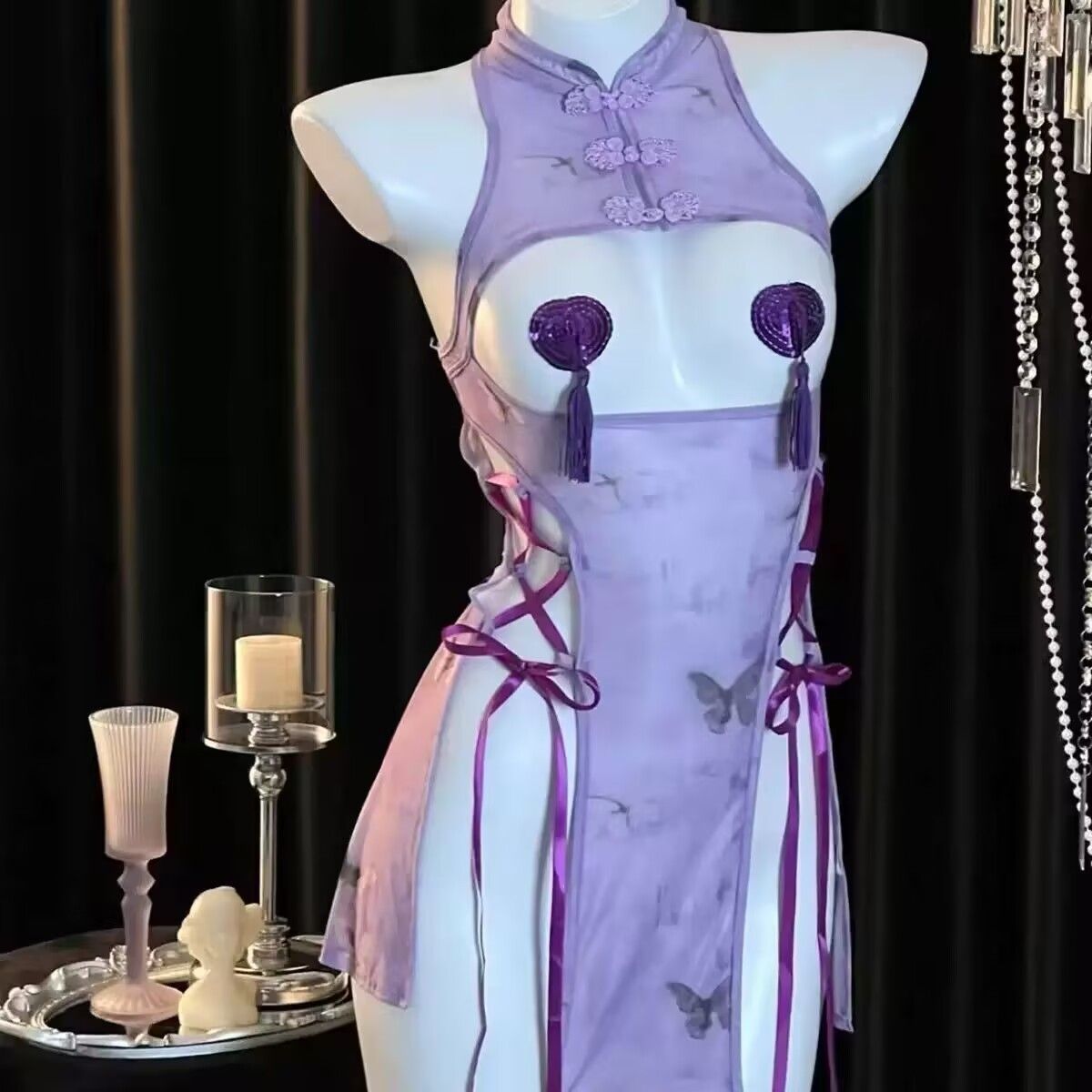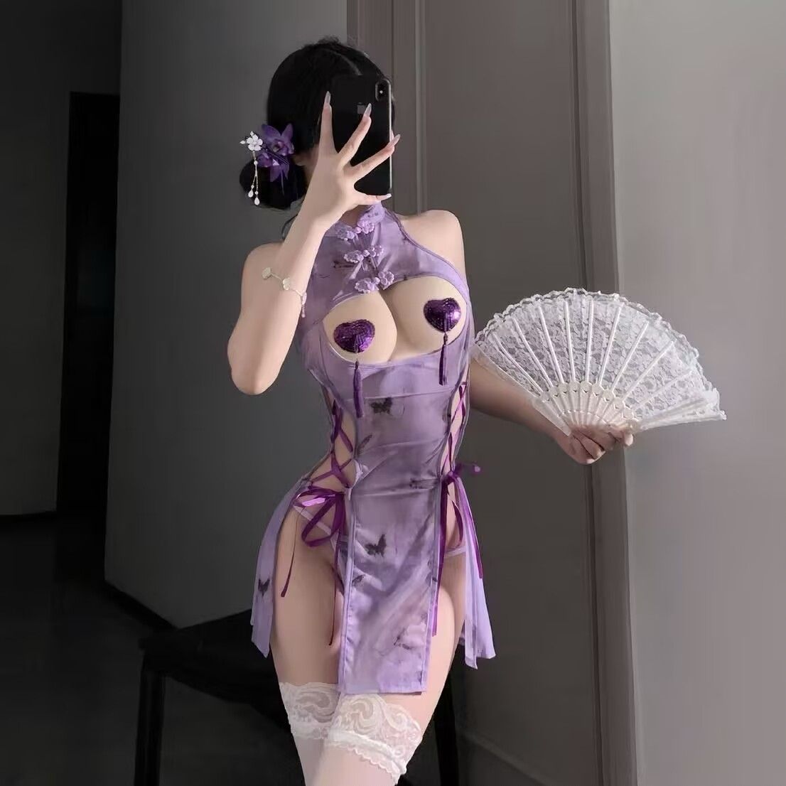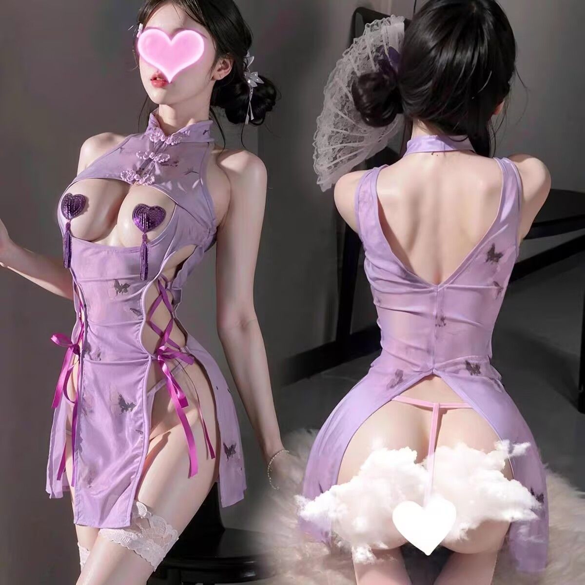 爆款情趣內衣性感紫色旗袍露乳小胸激情純欲禁欲床上免脫戰袍套裝