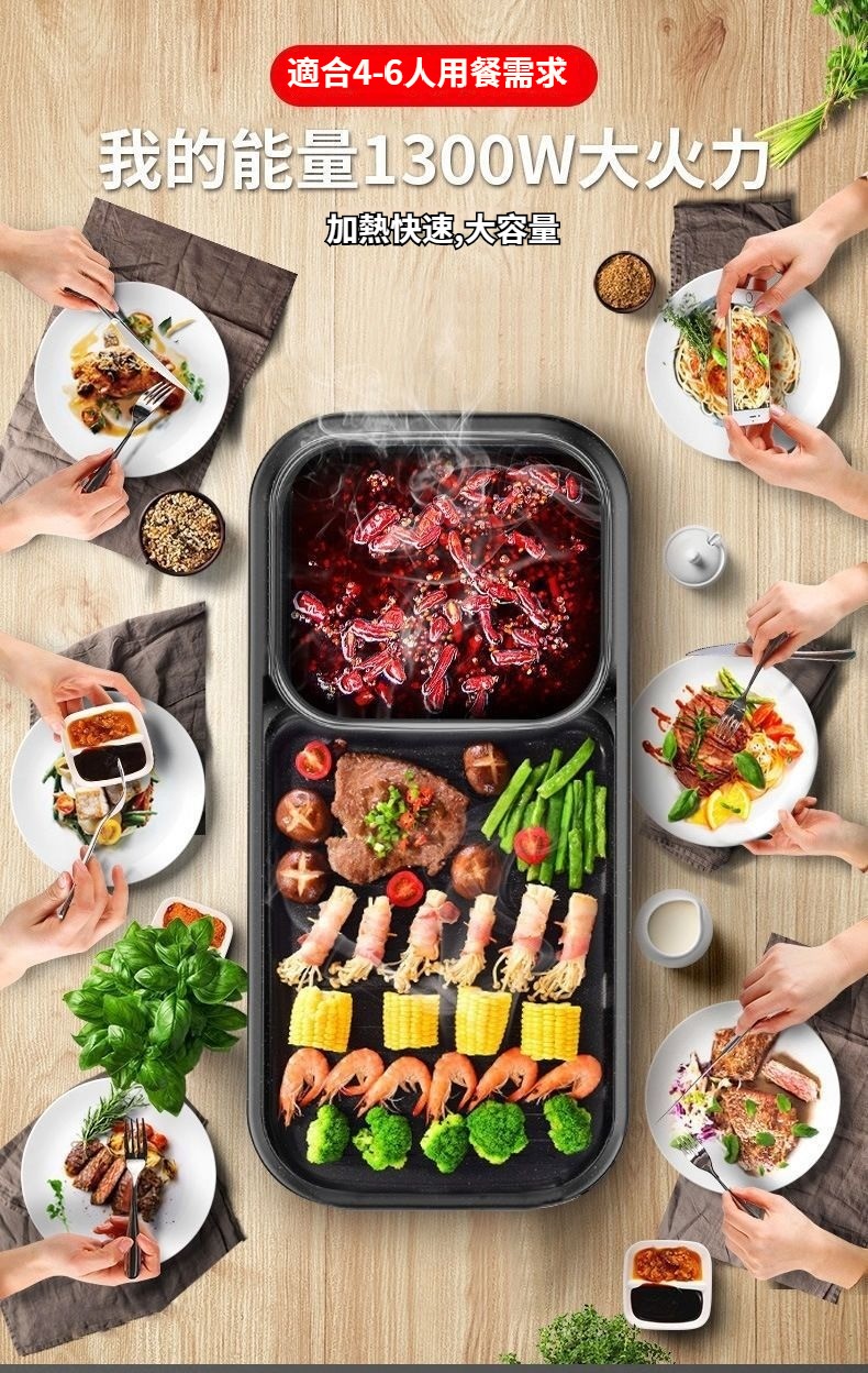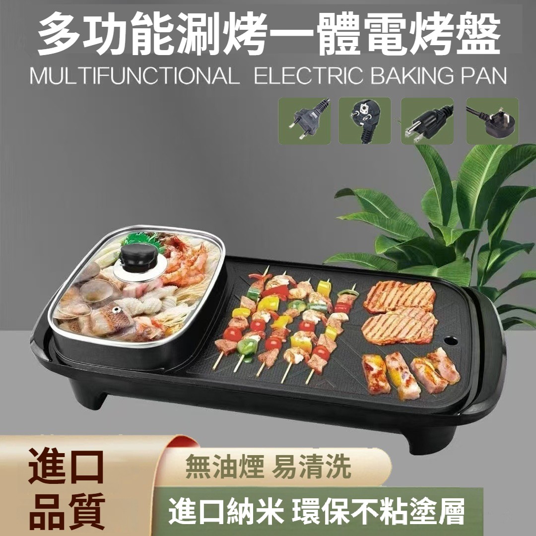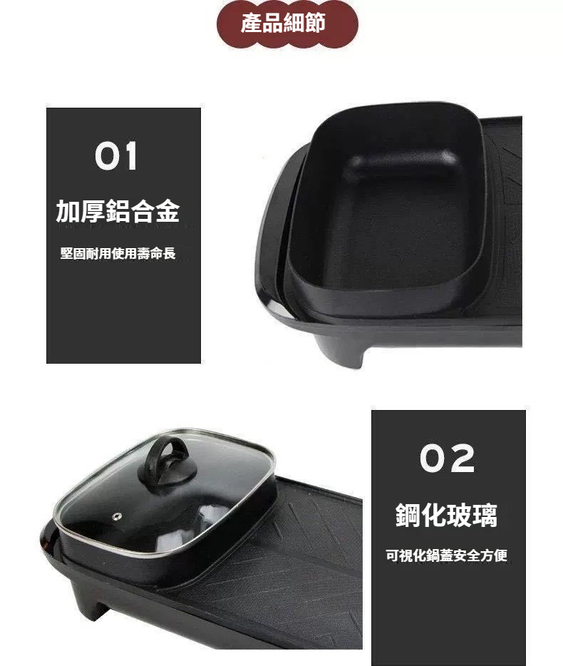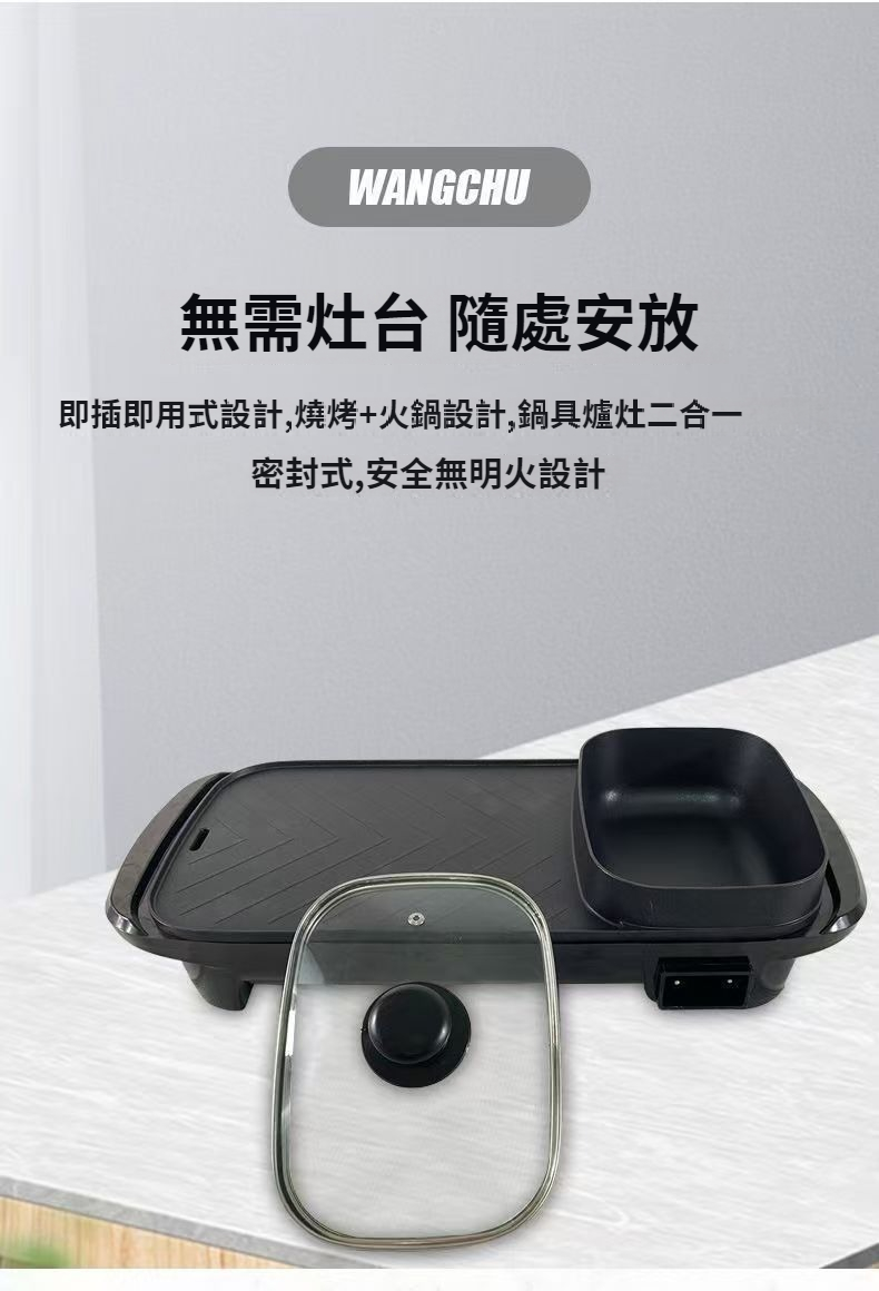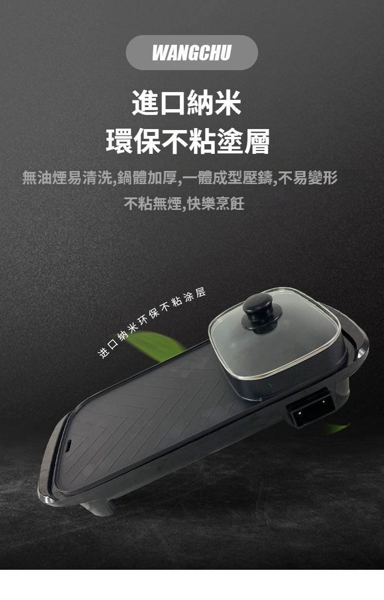 長方形多功能涮烤一體鍋.即插即用式設計,燒烤+火鍋設計,鍋具爐灶二合一.進口納米 環保不粘塗層 無油煙易清洗,鍋體加厚,一體成型壓鑄,不易變形 不粘無煙,砂光抛磨 細膩光滑好清洗 溫水加清潔劑 一擦即淨 NT$ 1599