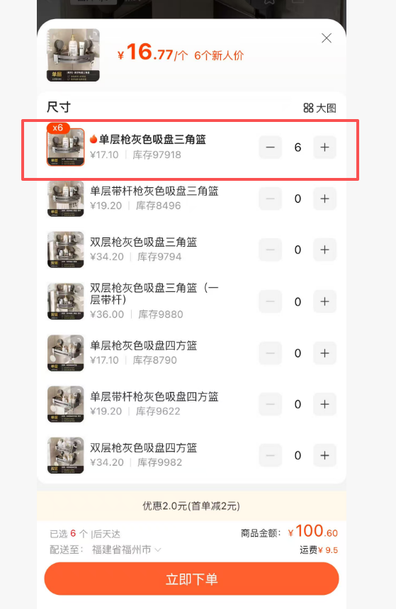 单层枪灰色吸盘三角篮 6个