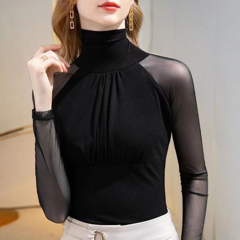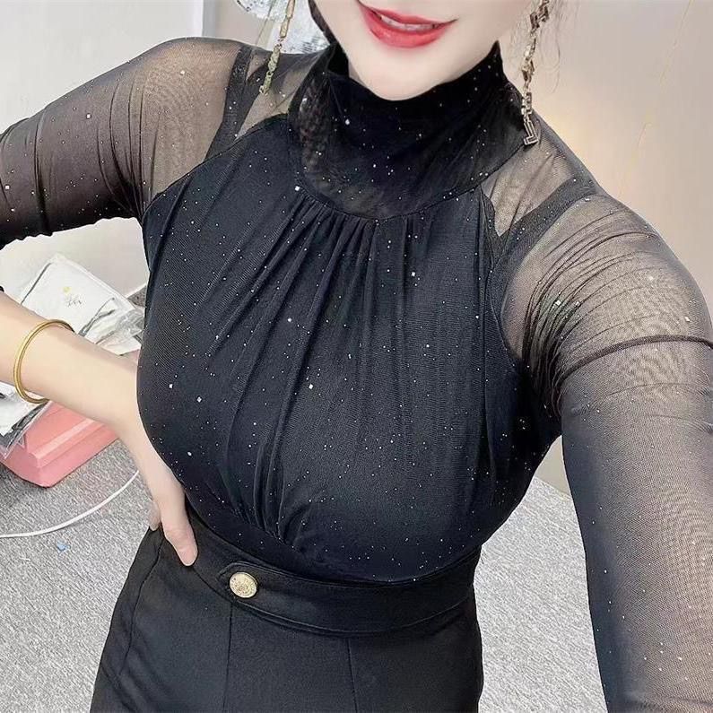 第 2 件 : 秋冬打底衫女新款高領亮片t恤女長袖洋氣修身網紗內搭上衣
