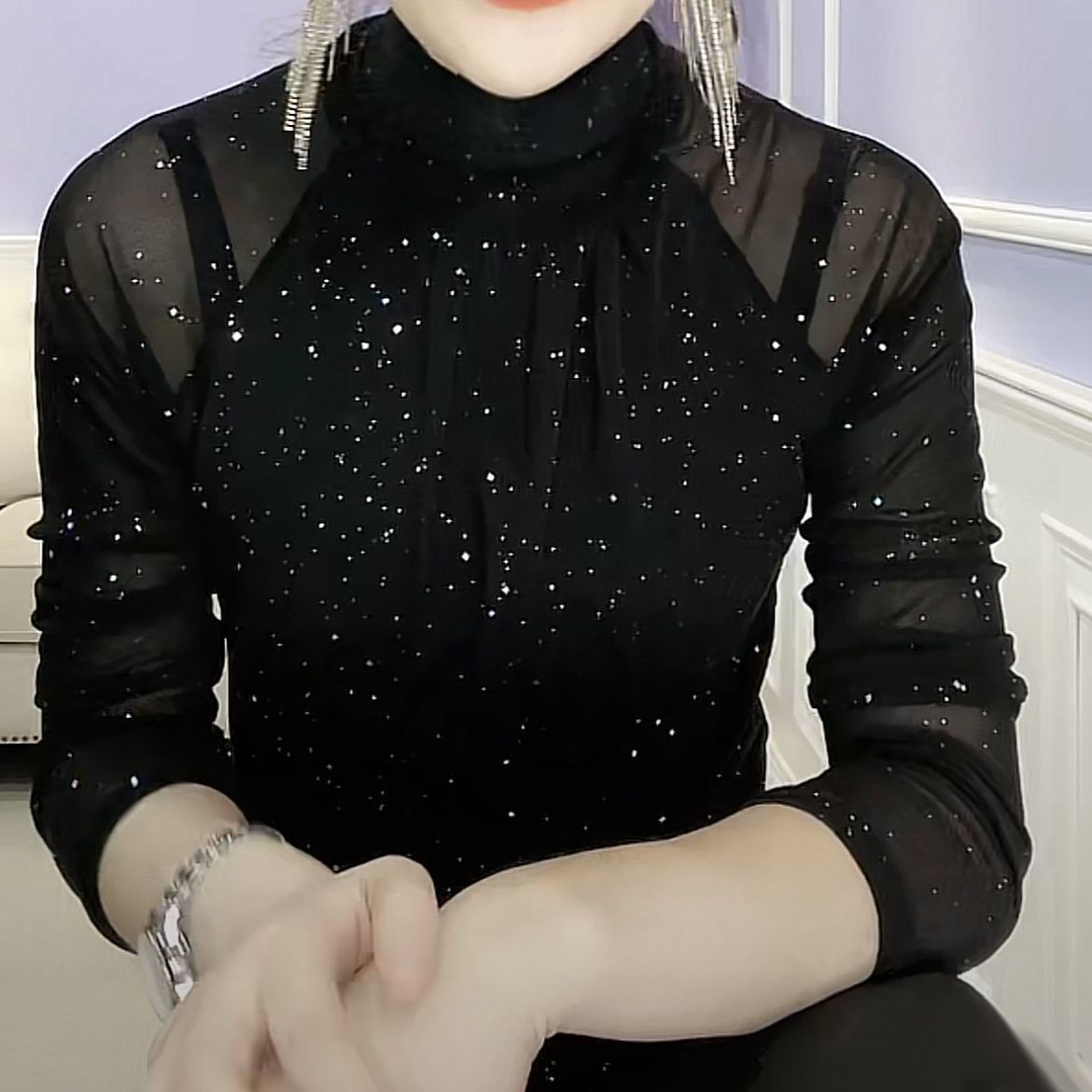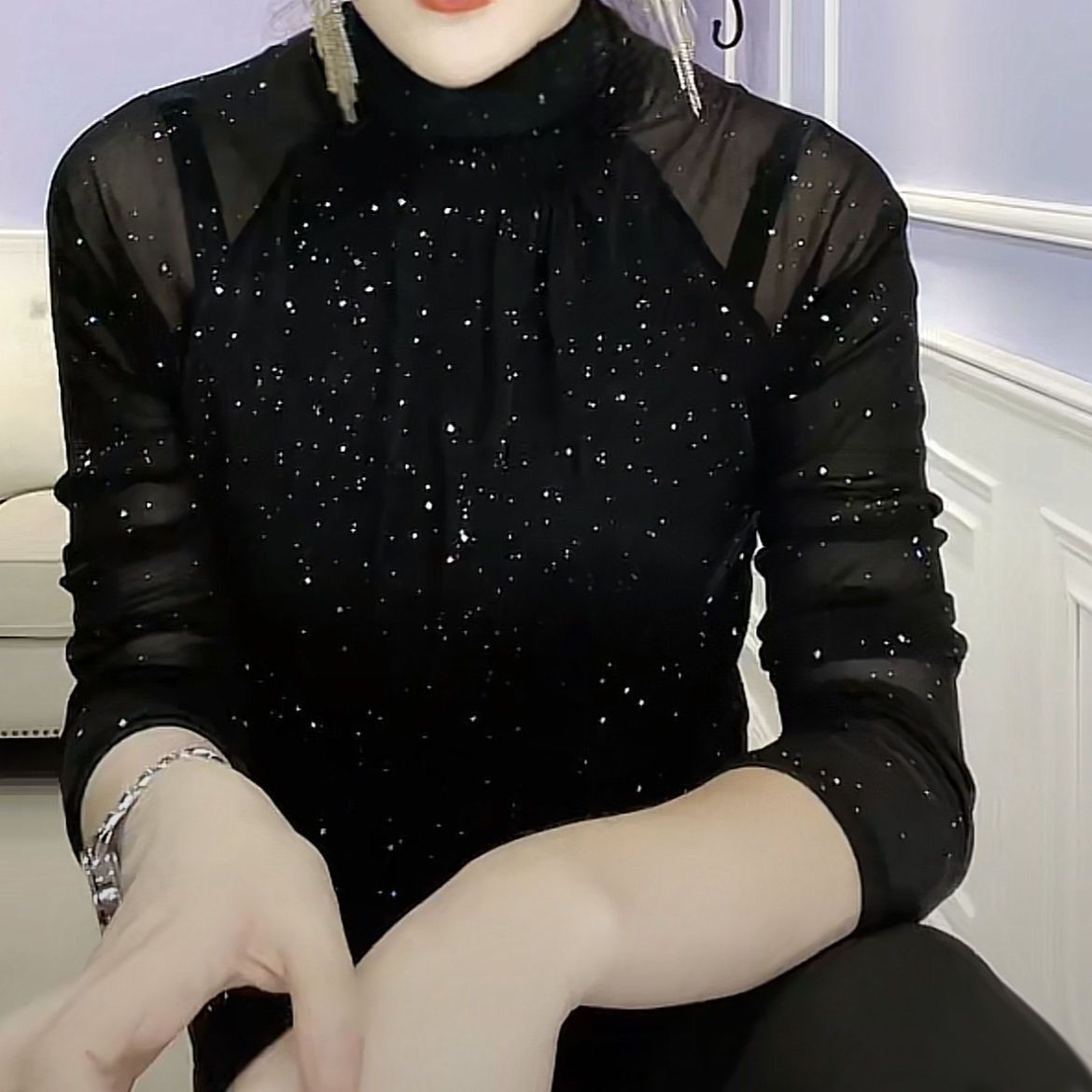 第 3 件 : 秋冬打底衫女新款高領亮片t恤女長袖洋氣修身網紗內搭上衣