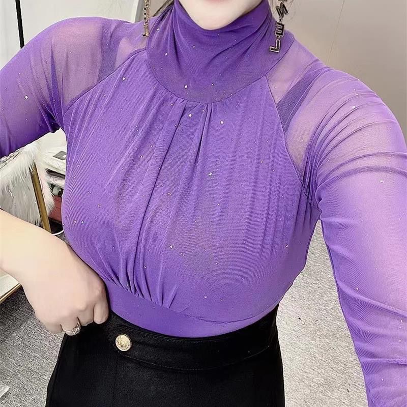 秋冬打底衫女,新款高領亮片t恤女長袖洋氣修身網紗內搭上衣