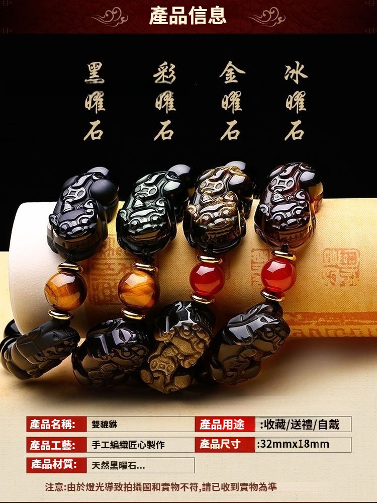 天然黑曜石雙貔貅手鍊佛珠皮丘虎眼石彩眼石手串