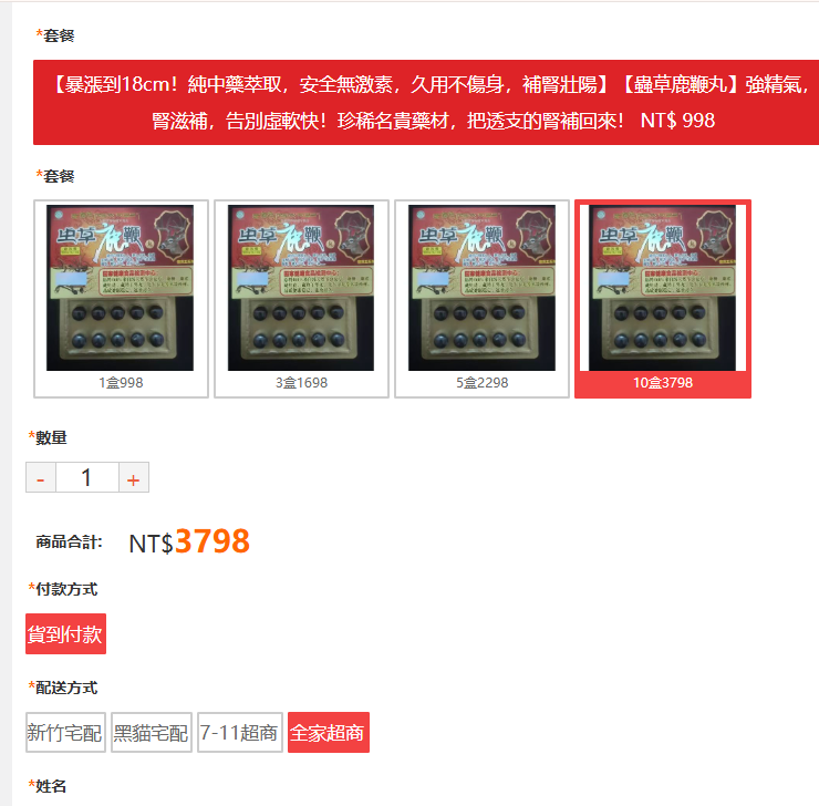 一、http://tw711.shop/ccdTZRwD 10盒蟲草鹿鞭丸(成本100元)