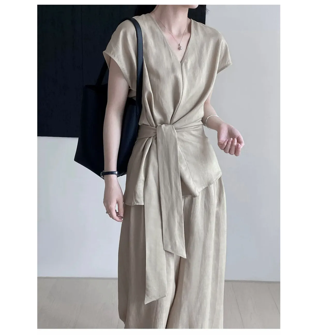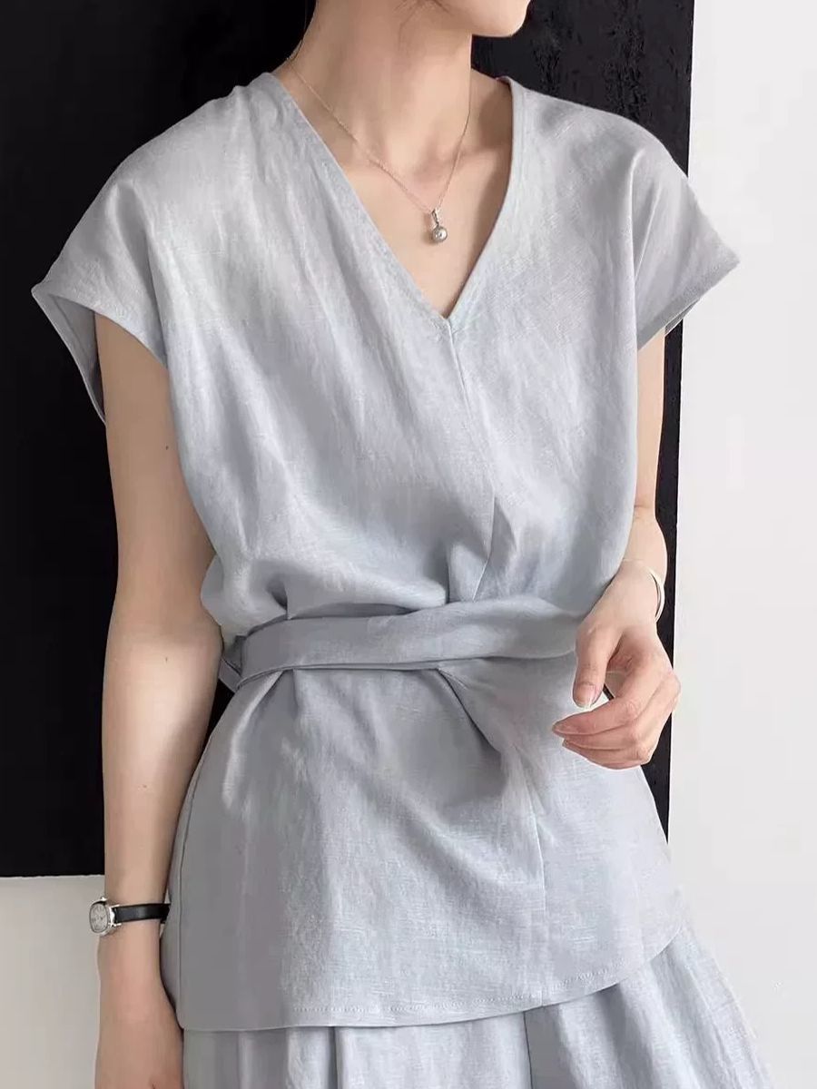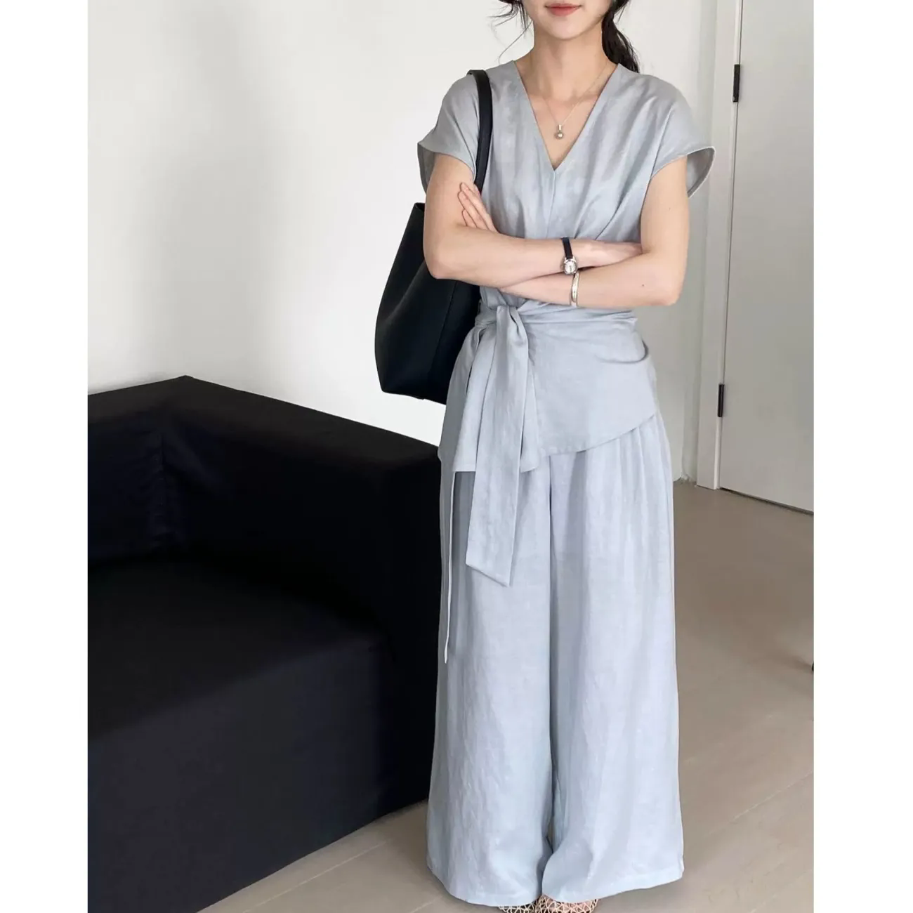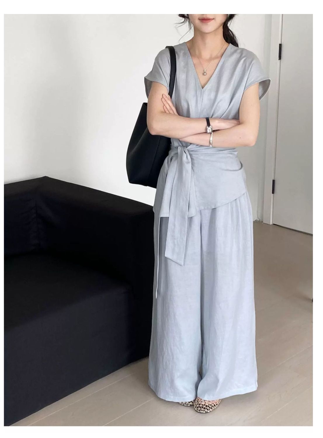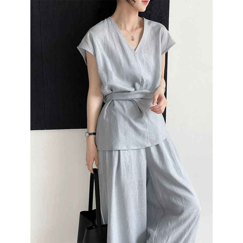 高級感棉麻V領帶收腰背心小衫顯瘦闊腿褲兩件時尚套裝