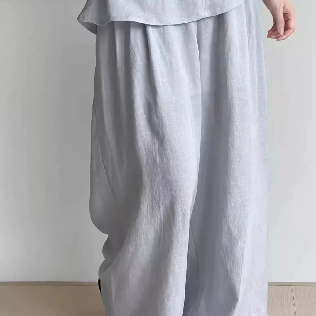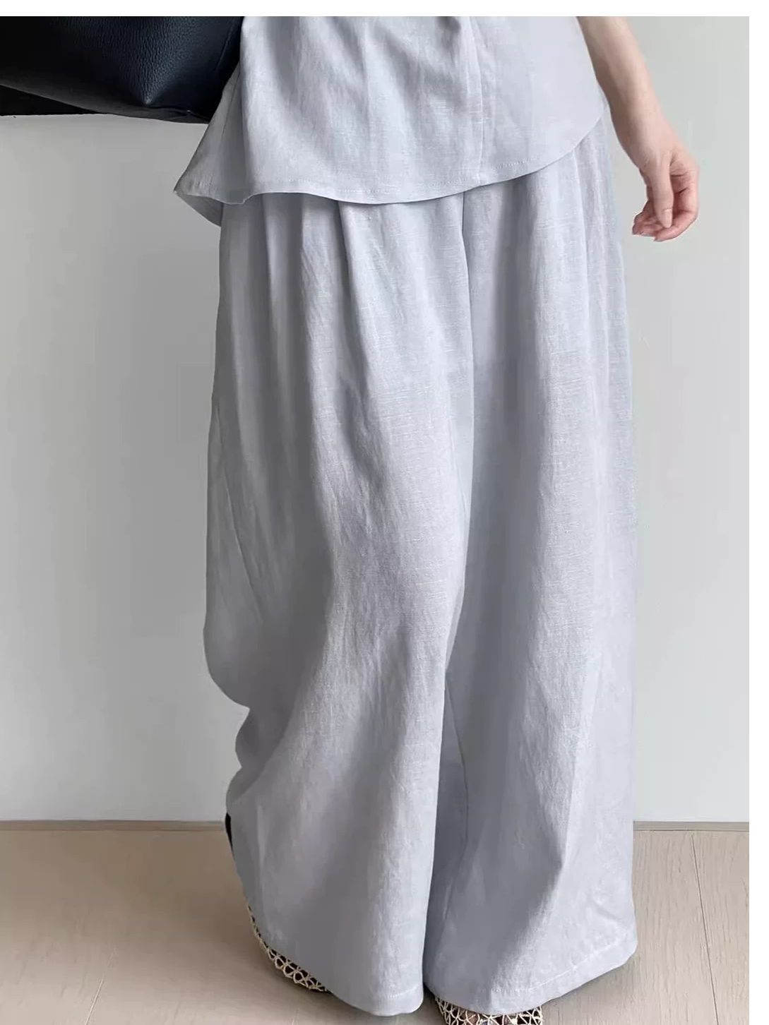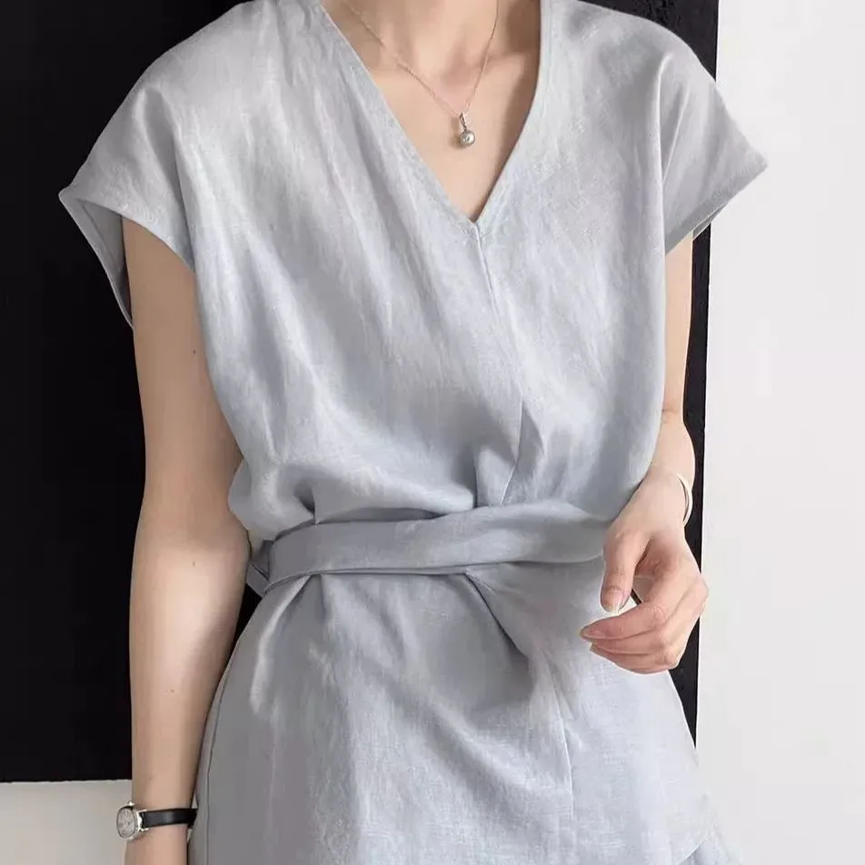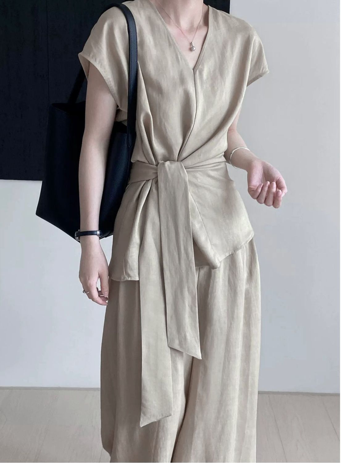高級感棉麻V領帶收腰背心小衫顯瘦闊腿褲兩件時尚套裝