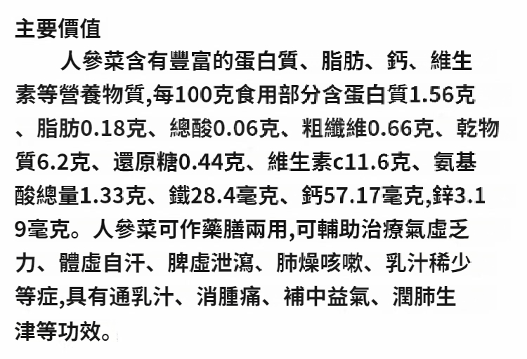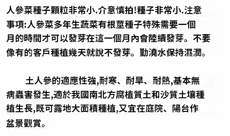 人參菜種子,又叫土人蔘,營養價值高,多年生草本,生長週期短,一個月採收,四季可種,渾身都是寶,葉子可炒菜,根部可燉湯,耐寒耐旱耐熱,無病蟲害,好養好種,新手也能輕鬆種活,庭院/陽臺/花盆均可種! NT$ 799