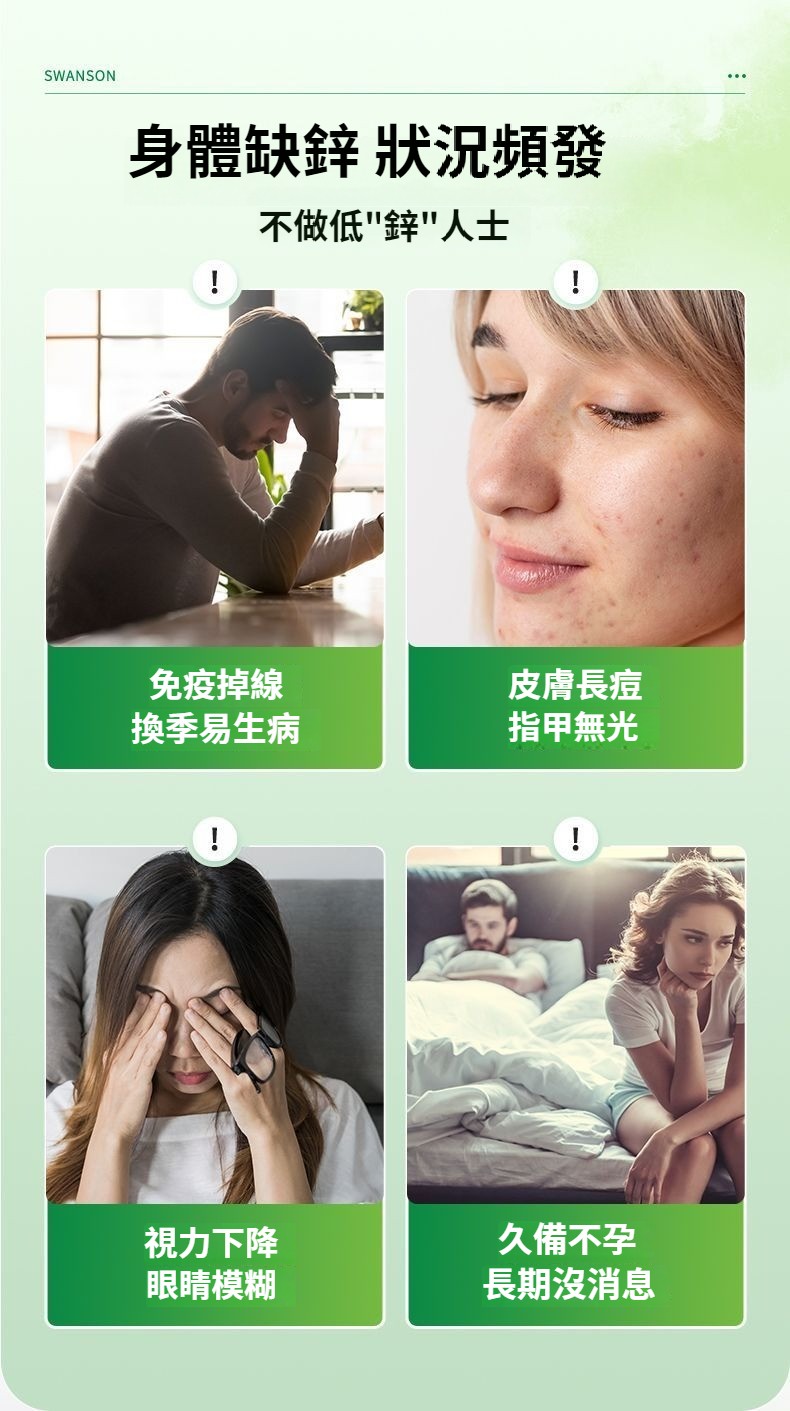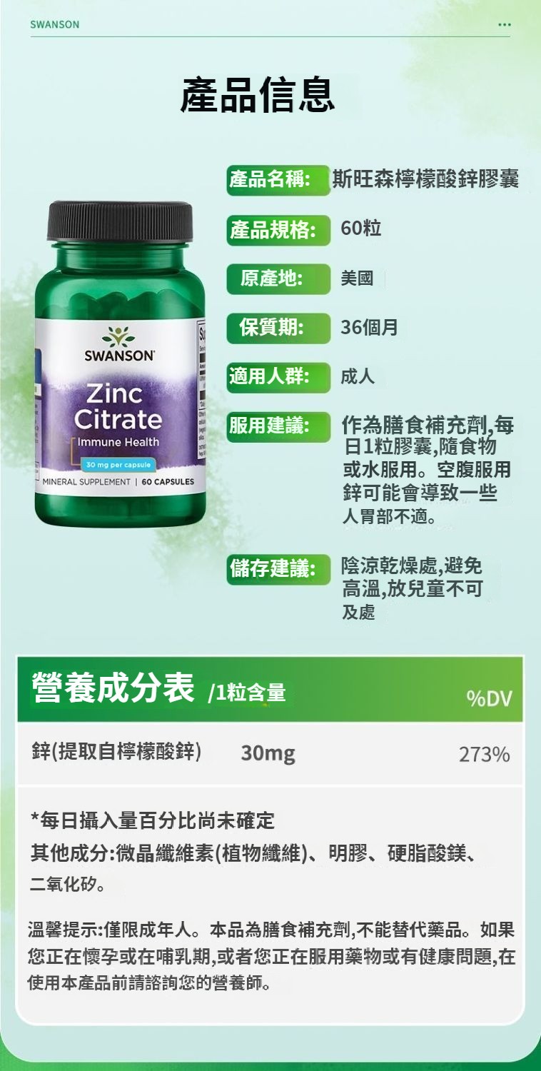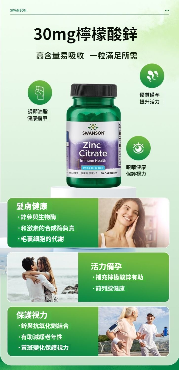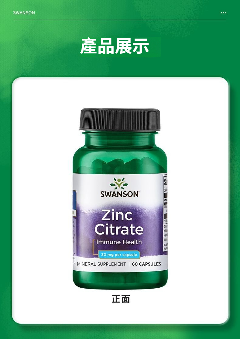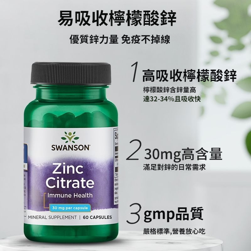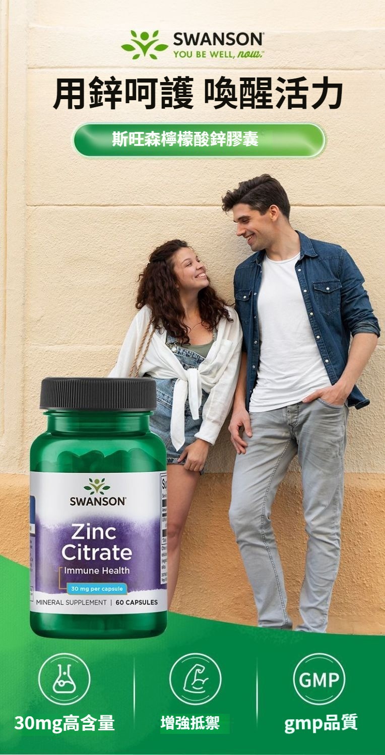 swanson斯旺森檸檬酸鋅60粒補鋅優質高吸收30mg用鋅呵護增強抵禦喚醒活力增強免疫力