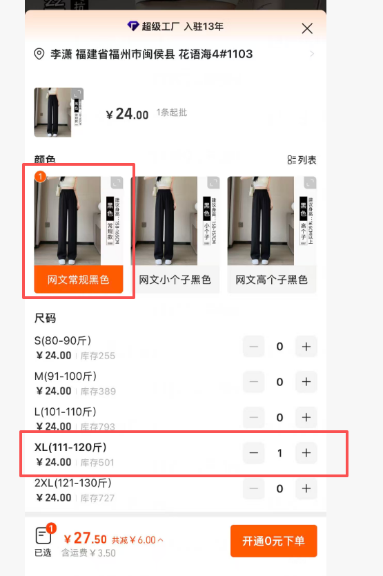 ②网文常规黑色 XL 码 1条