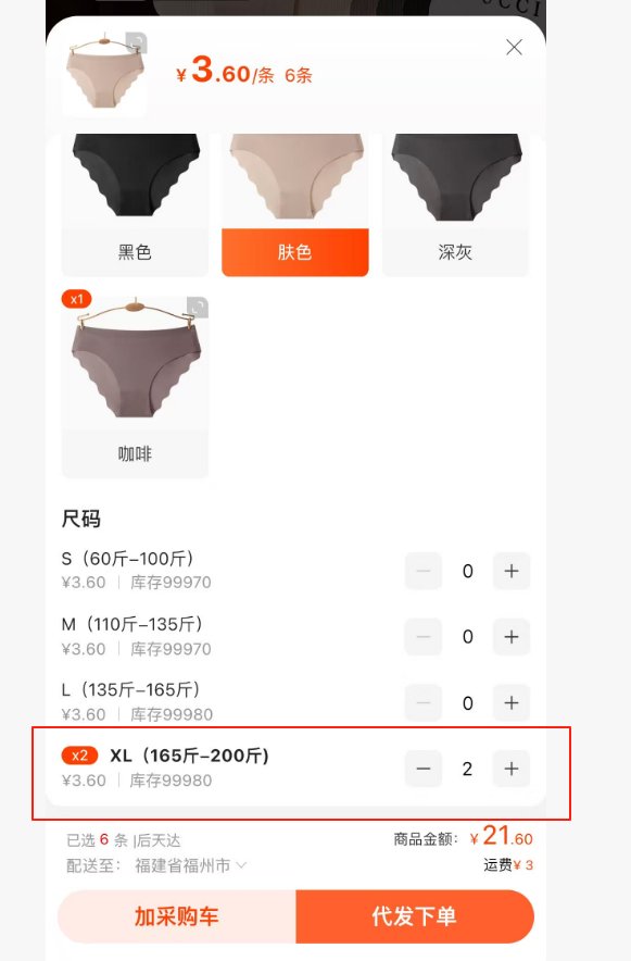 ①无痕内裤 6条XL(肤色*2、灰色*2、黑色*1、咖啡色*1)
