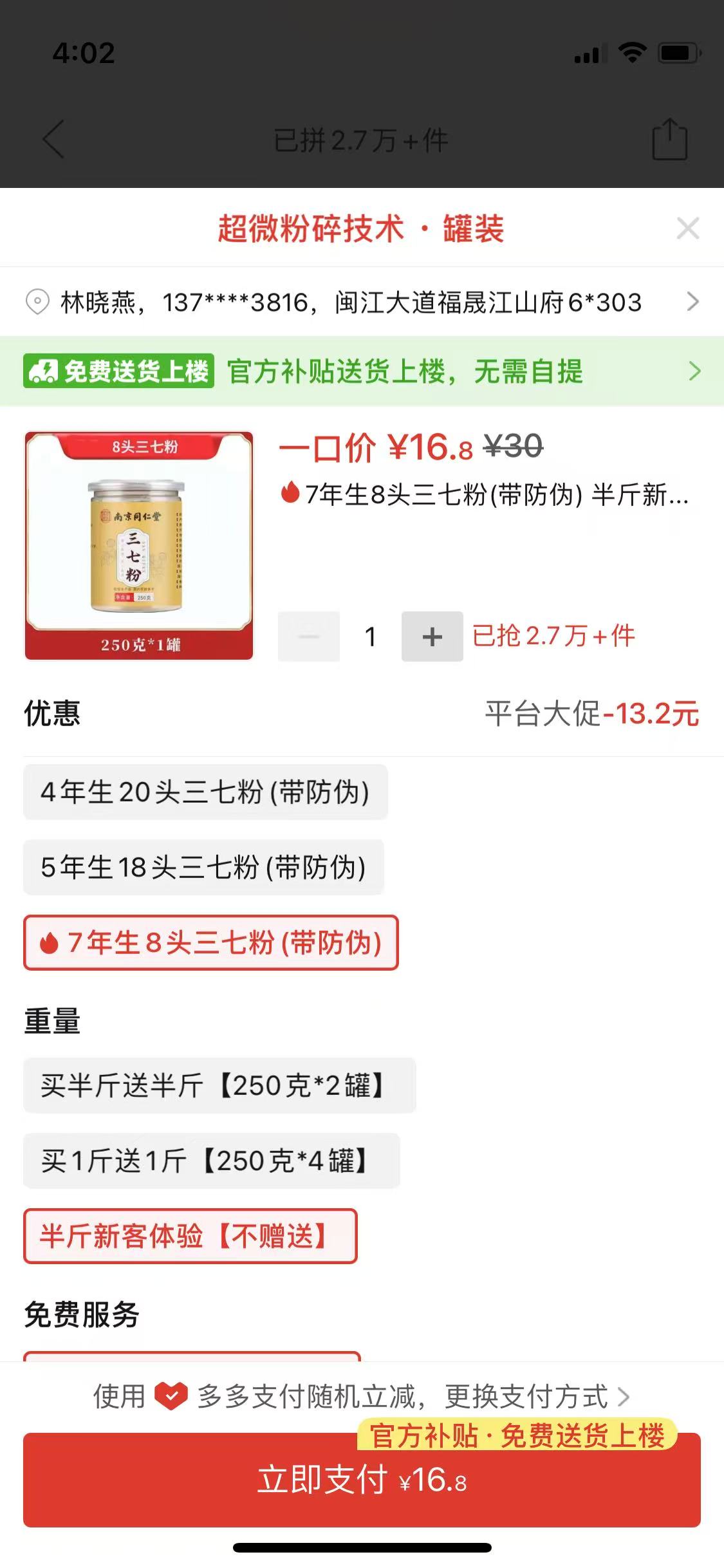 +③三七粉1罐16.8元:https://mobile.yangkeduo.com/goods2.html?ps=d8SLLfPjl3