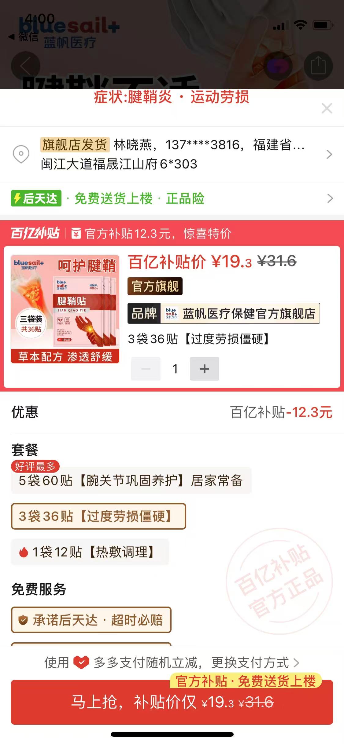 +②藍帆醫療腱鞘貼36貼19.3元:https://mobile.yangkeduo.com/goods1.html?goods_id=854774844717&page_from=51&pxq_secret_key=ZMMGPI6XXXLPEVT2F6YTICQK4ZHMIOH5CUVAKY2LAZTGVGOHGRLA&_oak_share_snapshot_num=960&_oak_share_detail_id=20560137263&_oak_share_time=1773217882&share_oak_rcto=YWI83cOVRjkrg-tDk0mHMxWKn4m_UXuML-738X8YHD1ivZA2CeEHK-Z-&share_uin=KBKL4TKIXK6F5FN76X6I2WQ3UI_GEXDA&refer_share_id=c9ce05705d034b1b96e2c992805ebcf2&refer_share_uin=KBKL4TKIXK6F5FN76X6I2WQ3UI_GEXDA&refer_share_channel=copy_link&refer_share_form=text&uin=DNI7TGLJ2FTDPLYFXEZ2RMKMOE_GEXDA