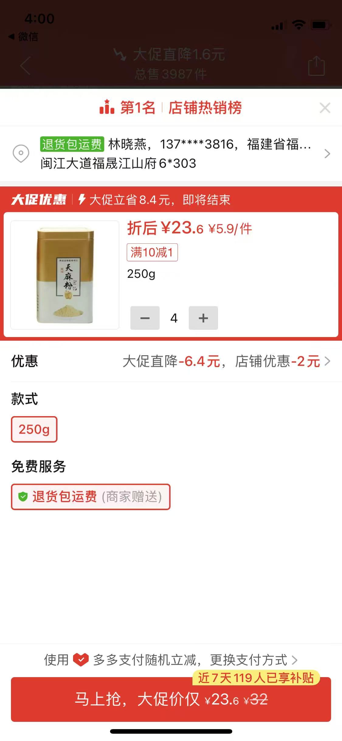 ①天麻粉4罐23.6元:https://mobile.yangkeduo.com/goods2.html?goods_id=798743904317&page_from=23&pxq_secret_key=MV6JKKG2GACDX6ILJZGTGSNTNFWSF2NNNQM5QTGRIVBHO7HZCJVA&_oak_share_snapshot_num=640&_oak_share_detail_id=12377687265&_oak_share_time=1772786156&share_oak_rcto=YWJkTosyvBv8QgJD27k_o7LFIjJ1rr747RISNyQNg2uOHnE3fAZ2zKKS&share_uin=SOM5K5ZEZ257SGUSUUZJB2IOIM_GEXDA&refer_share_id=0eda86ce92374886b289b7d65031ce0e&refer_share_uin=SOM5K5ZEZ257SGUSUUZJB2IOIM_GEXDA&refer_share_channel=copy_link&refer_share_form=text&uin=DNI7TGLJ2FTDPLYFXEZ2RMKMOE_GEXDA