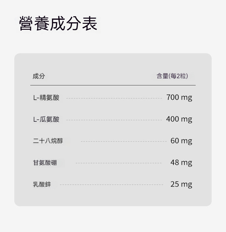 相比於市面上的微量添加,這款精氨酸膠囊足足添加了700mg精氨酸和400mg瓜氨酸