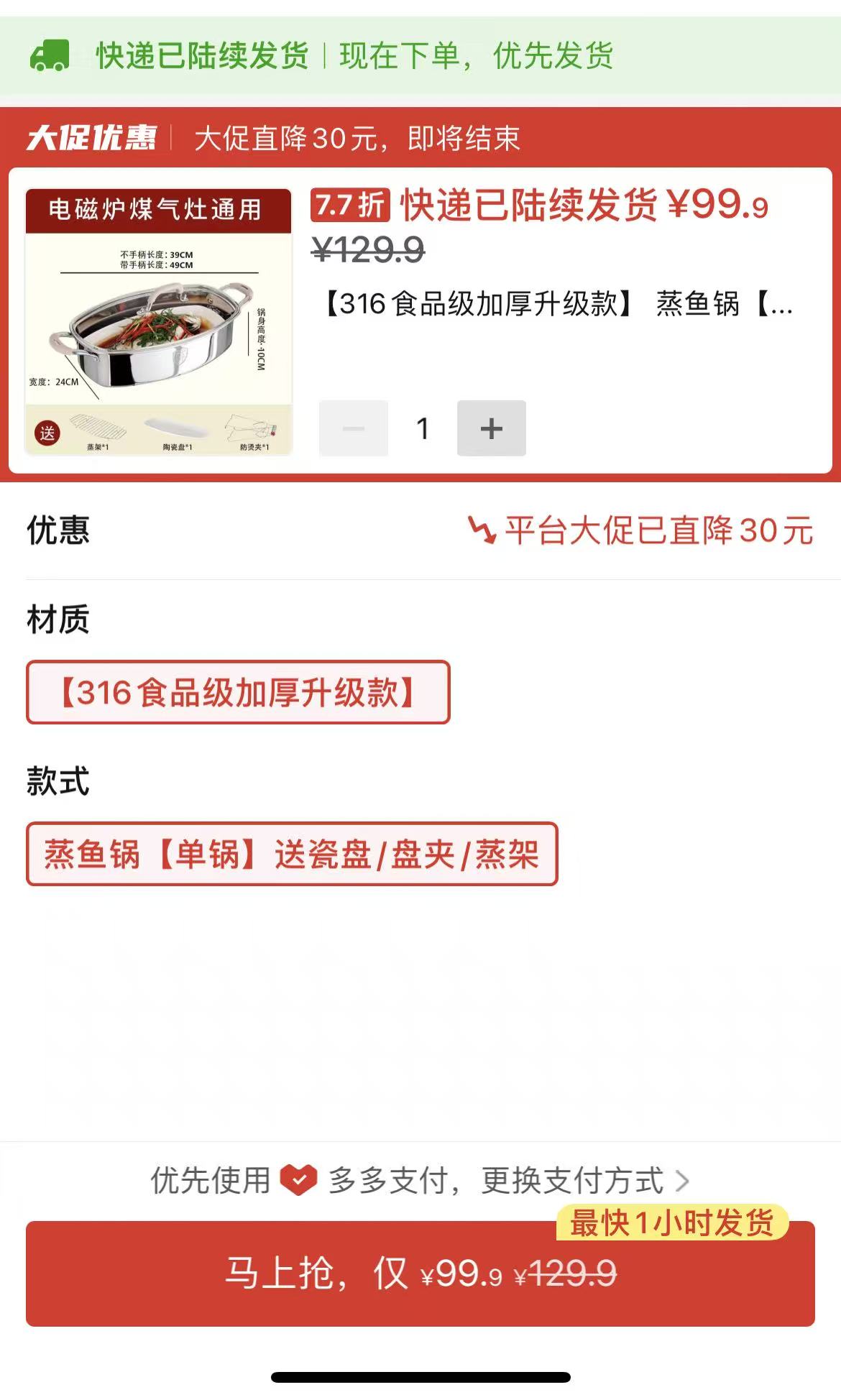 不鏽鋼蒸魚鍋1個+送3件套99.9元:https://mobile.yangkeduo.com/goods2.html?ps=QKdslPwWux
