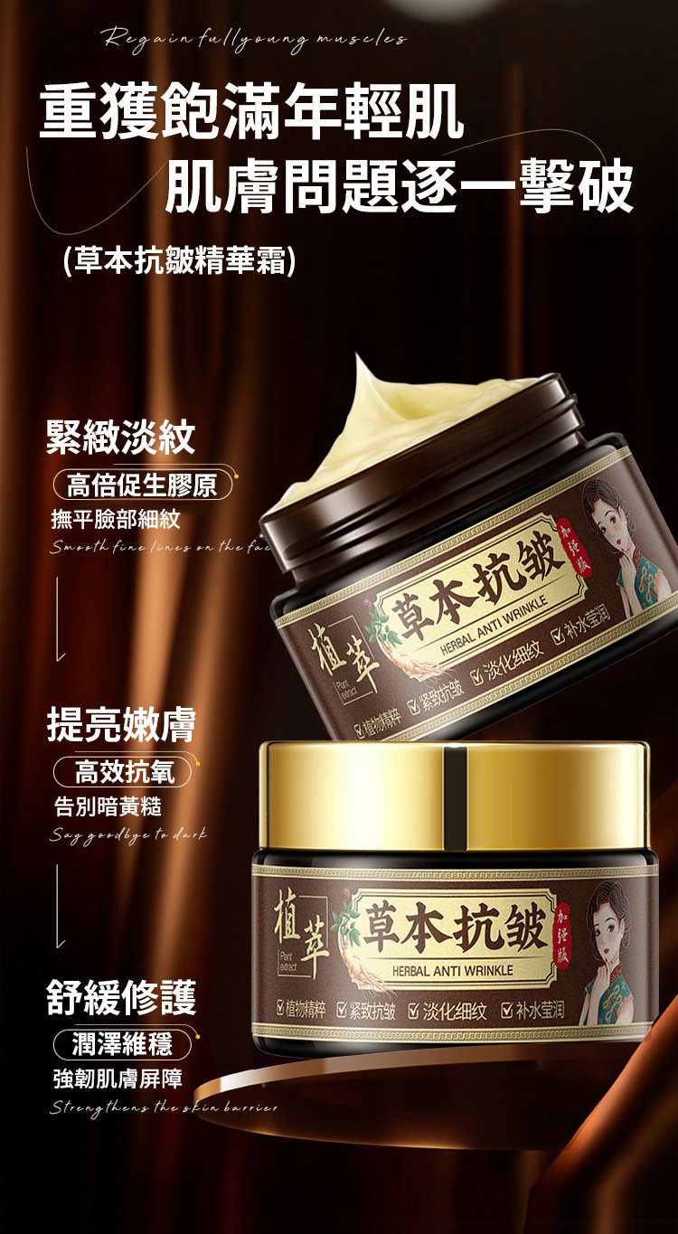 嫩過同齡人!【早晚一抹,解決垮臉暗黃】草本抗皺精華霜,重獲飽滿年輕肌,肌膚問題逐一撃破!實力見證!淡紋·緊緻·煥亮 NT$ 799