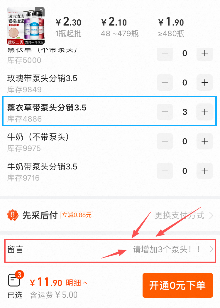 ③卓酷去角質搓泥寶薰衣草香3瓶(要加泵頭,下單聯絡客戶改價!備註加3個泵頭!!);採購價:11.9元+泵頭3個*0.5元=13.4元