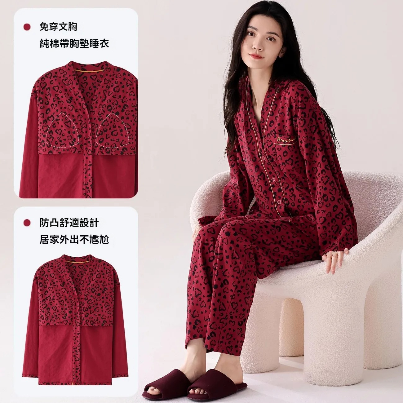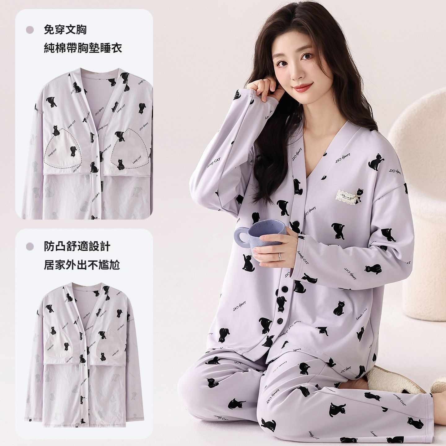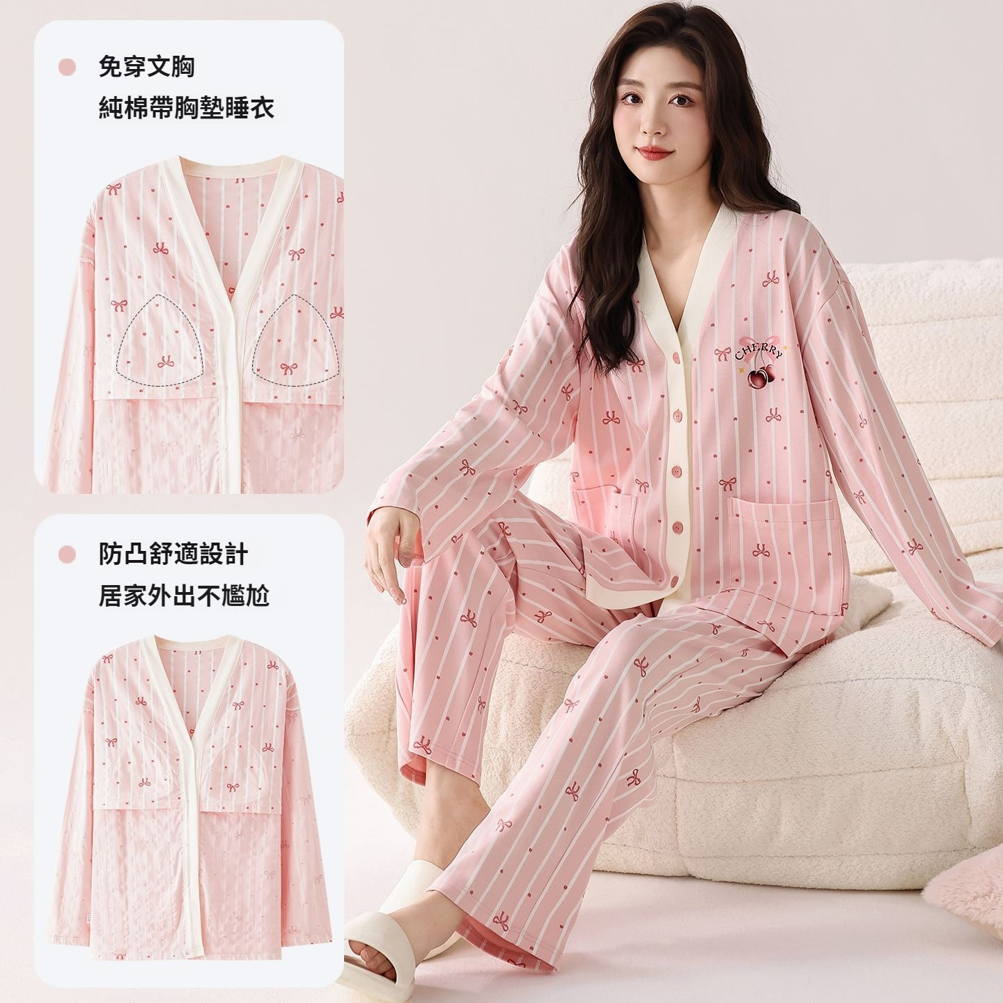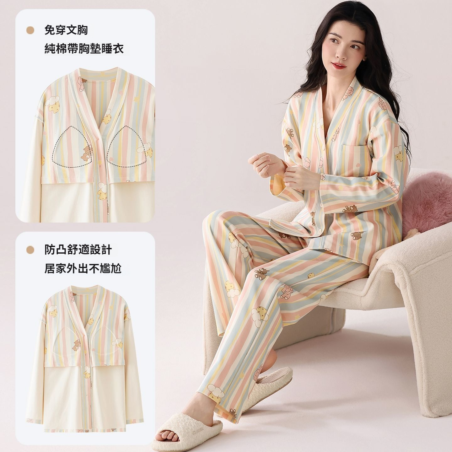 女款春秋季睡衣【純棉帶胸墊長袖加大碼】可外穿高級感家居服