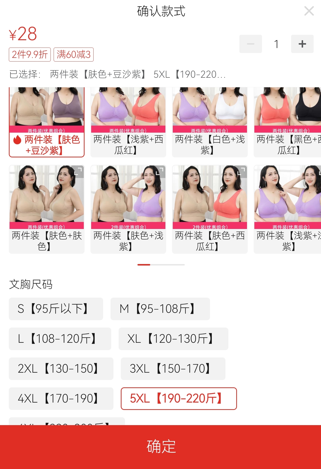 ①内衣2件(膚色+豆沙紫) 5XL (190-220斤)28元 https://mobile.yangkeduo.com/goods2.html?ps=YgO9AjgfdG