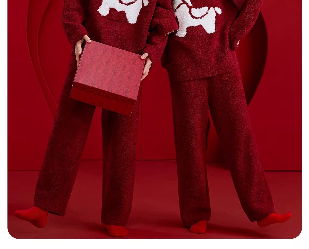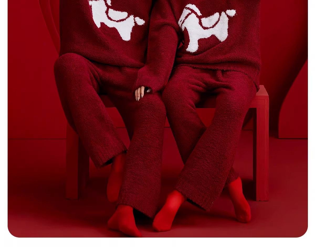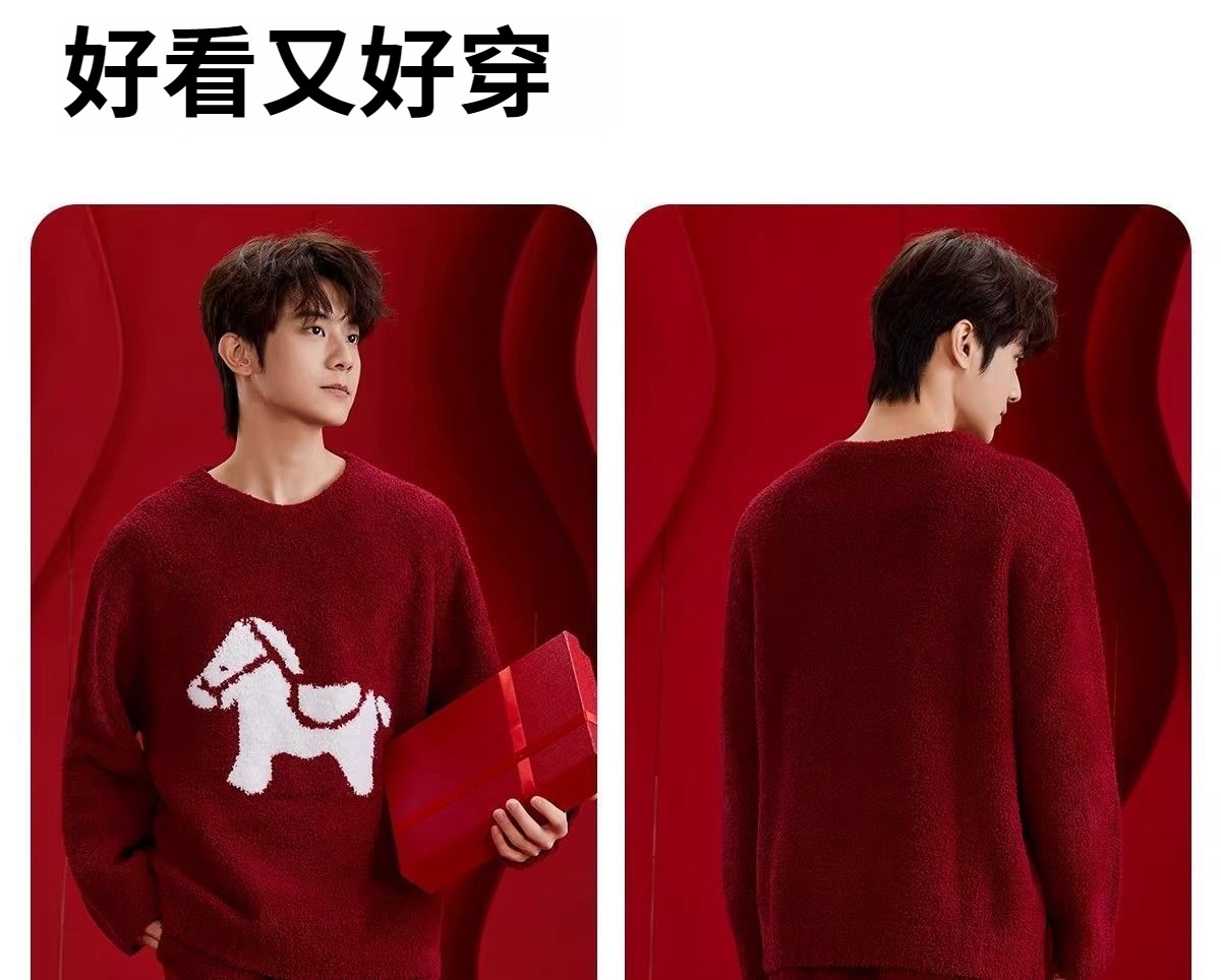 第 2 件 : 新款半邊絨紅色馬年本命年2026冬季睡衣結婚情侶男女套裝圓領