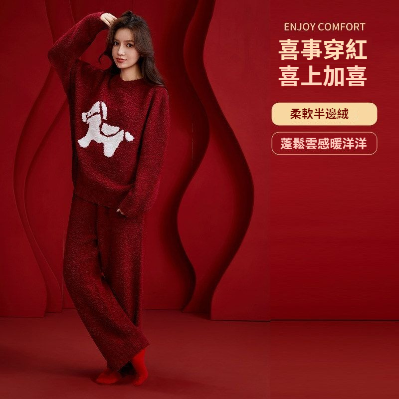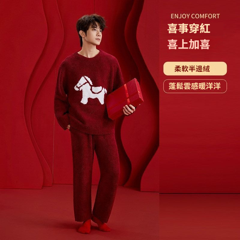 第 1 件 : 新款半邊絨紅色馬年本命年2026冬季睡衣結婚情侶男女套裝圓領
