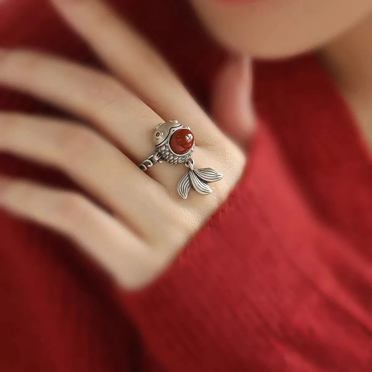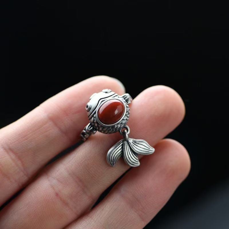 新中式做舊復古風石榴紅錦鯉戒指,可調式戒指國風可愛小眾百搭飾品