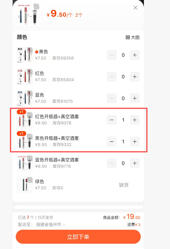 開瓶器+真空酒塞 2套(紅色*1、黑色*1)