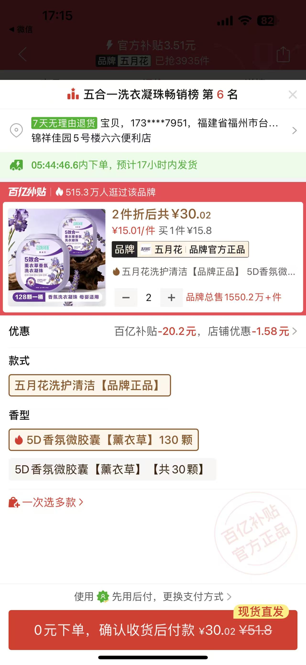 五合一薰衣草香氛洗衣凝珠130颗的2入组