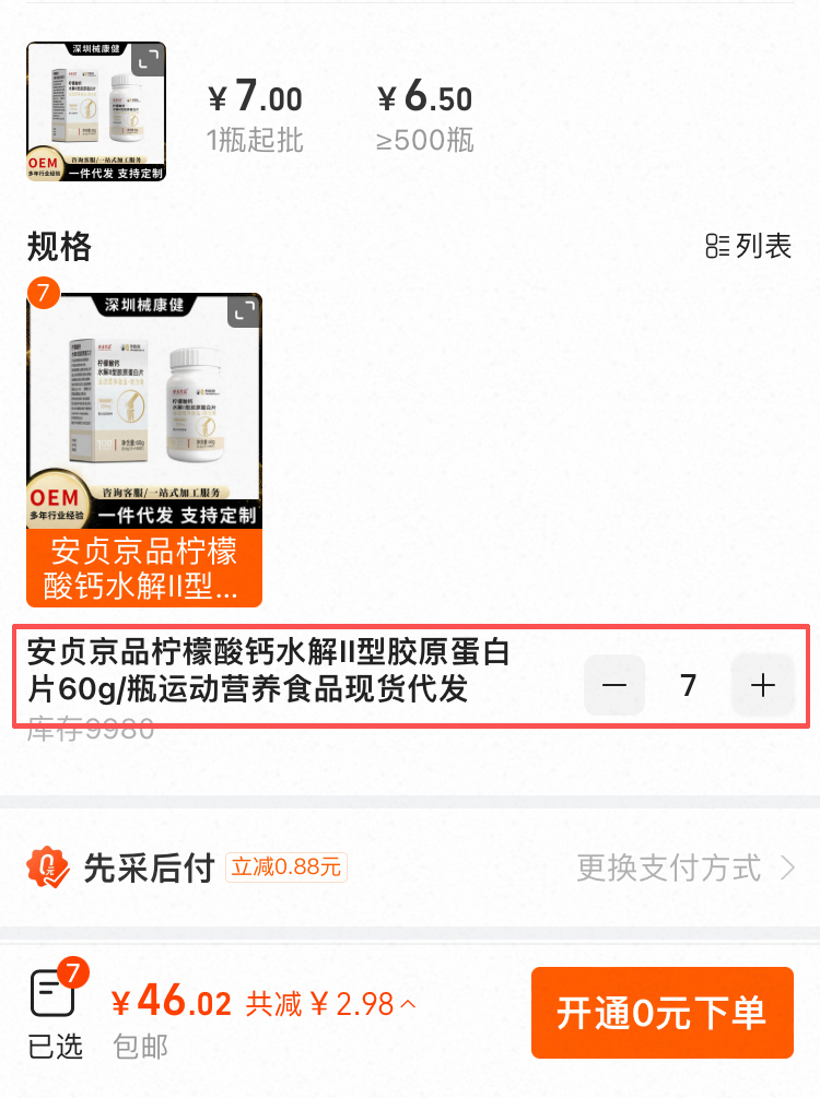 7瓶 檸檬酸鈣 安贞京品柠檬酸钙水解|I型胶原蛋白片,採購價:46.02元