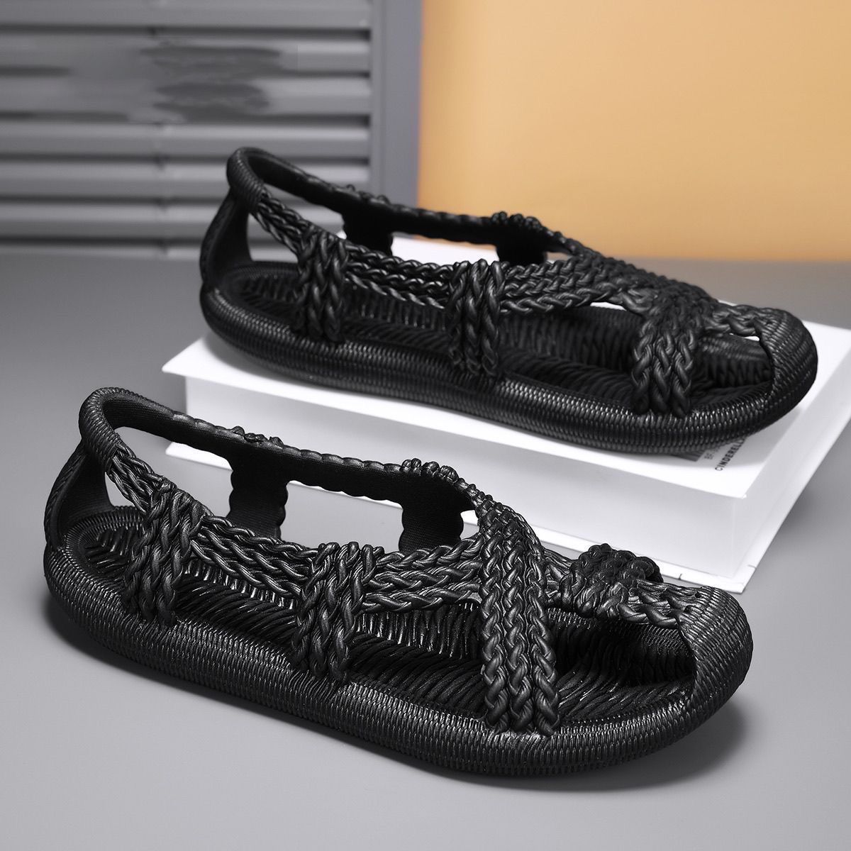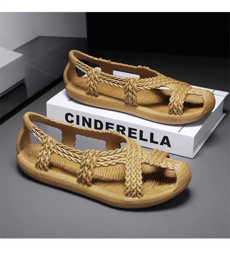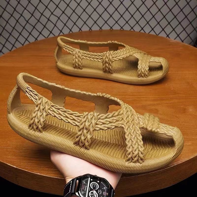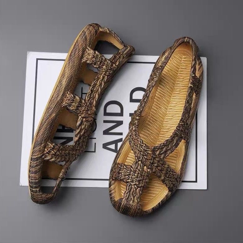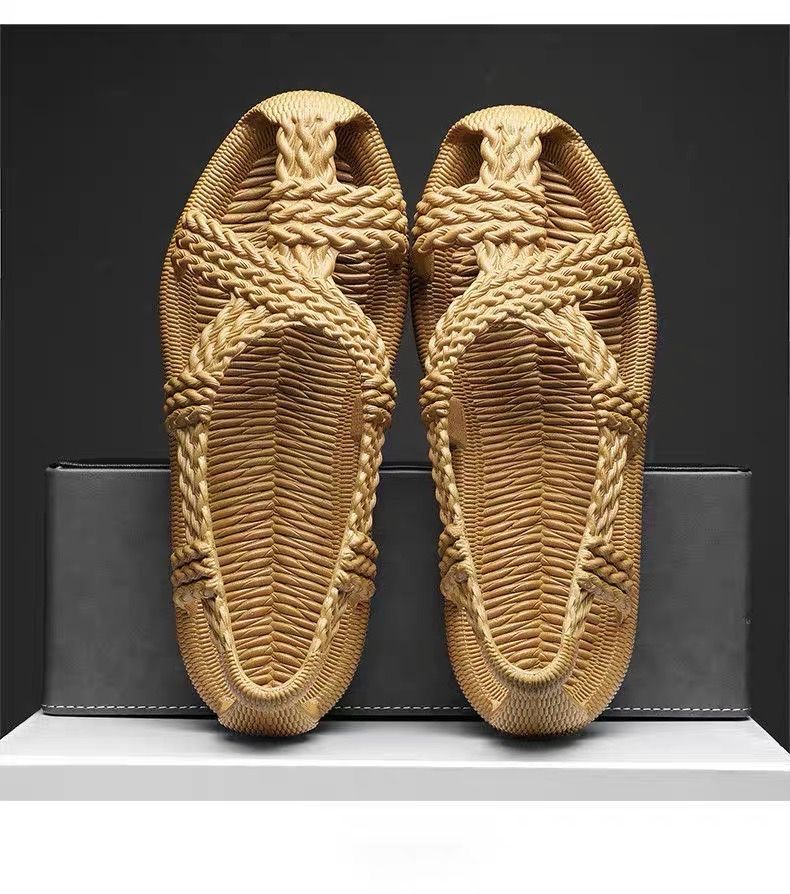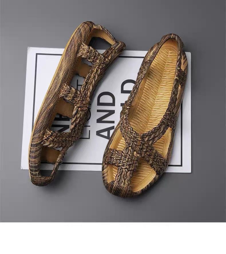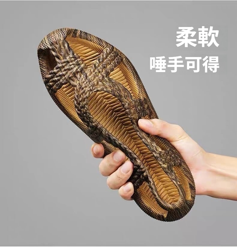 第 1 件 : 夏季復古手工編織鞋軟底透氣防滑沙灘鞋沙灘男女涼鞋橡膠藤編草鞋